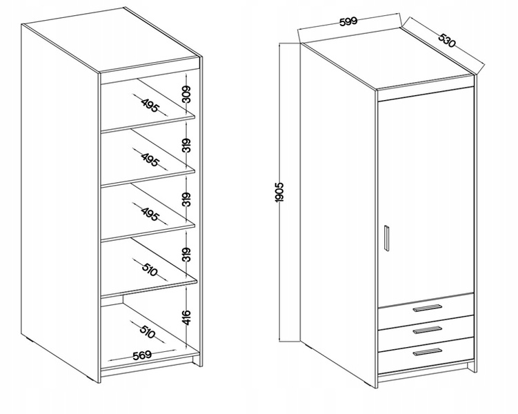 - wymiary: 599 x 1905 x 530mm (szer. x wys. x gł.)