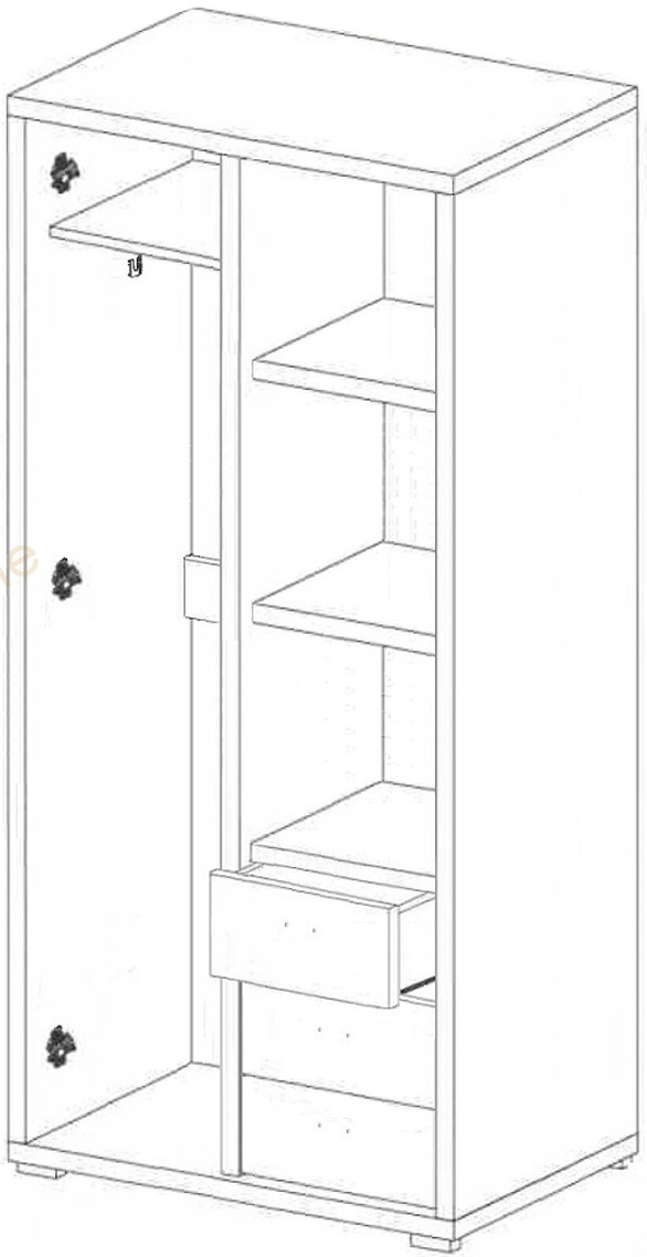 Szafa postawiona na nóżkach z tworzywa, posiada dwa uchylne fronty oraz trzy szuflady. W lewej części znajduje się drążek na wieszaki.