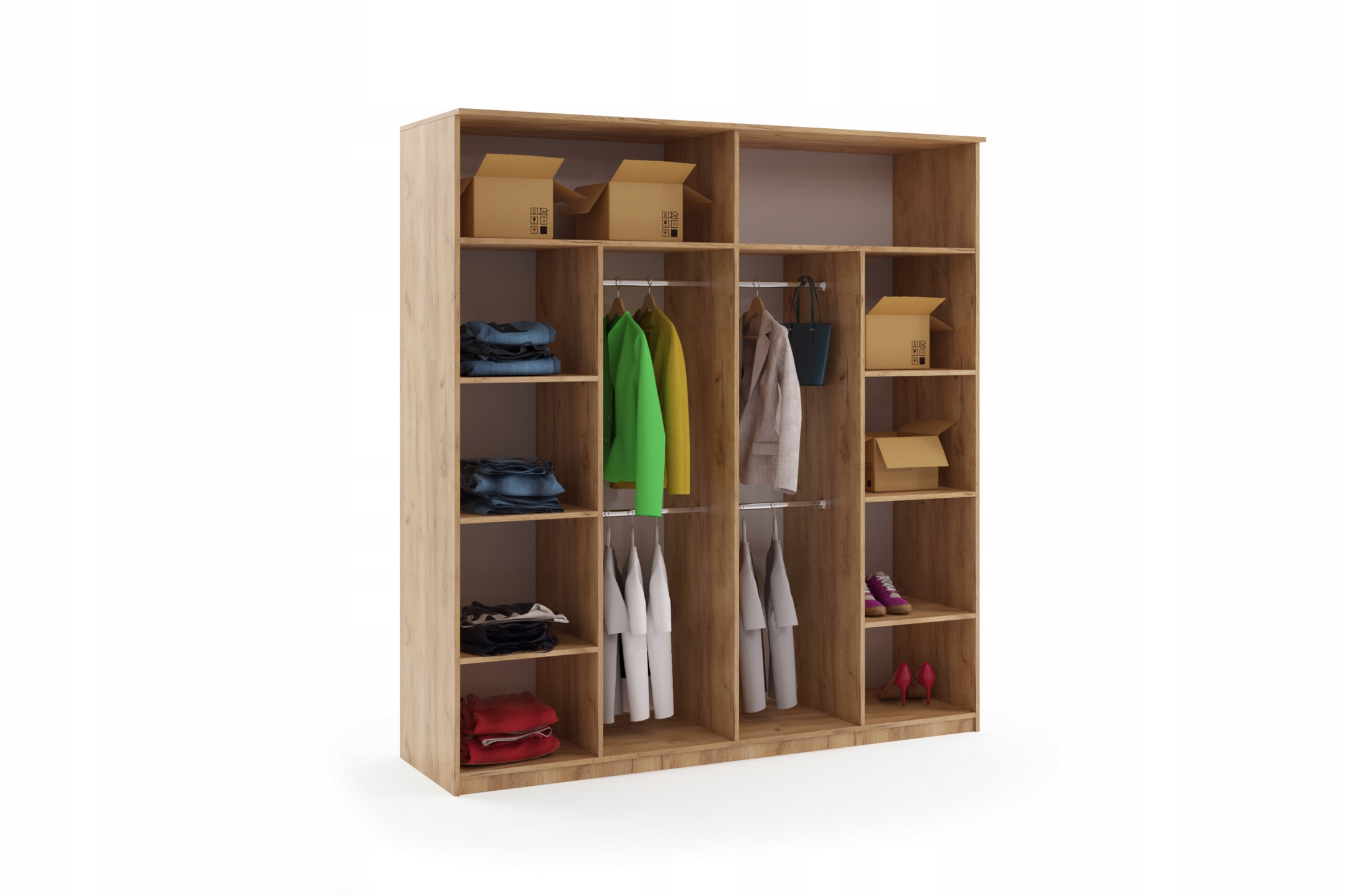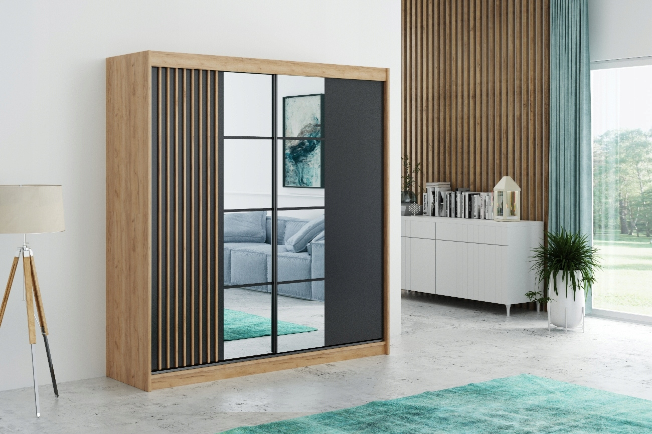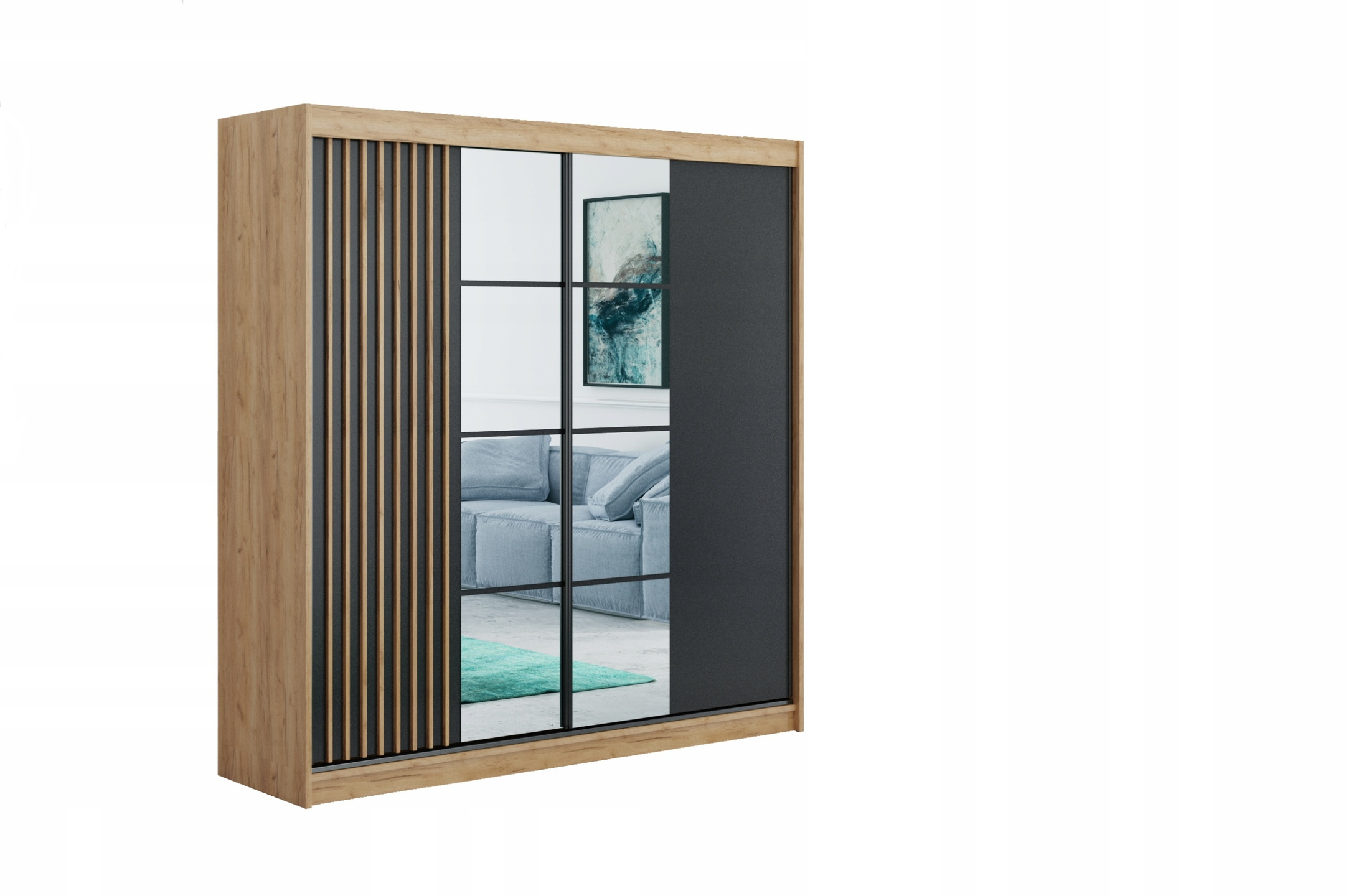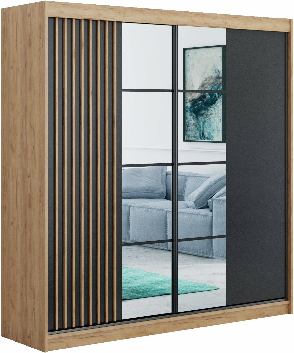 Szafa posiada drzwi przesuwne, po jednej stronie ozdobione efektownymi lamelami oraz lustrem, natomiast drugi front jest w połowie wyklejony lustrem, druga część frontu jest gładka.