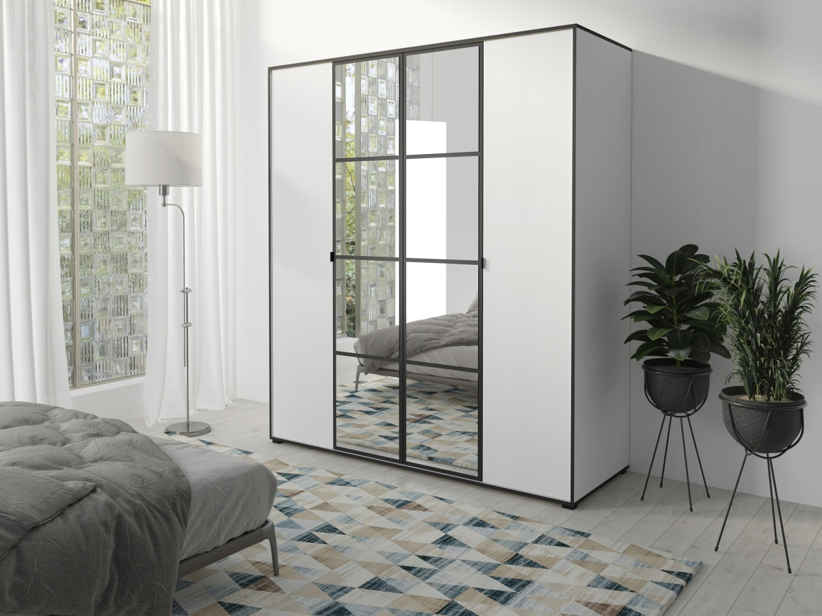 Szafa posiada cztery uchylne fronty. Wewnątrz po lewej stronie znajdują się półki a po prawej stronie drążek na wieszaki. Doskonale sprawdzi się w salonie, ale również w sypialni, przedpokoju czy pokoju młodzieżowym.