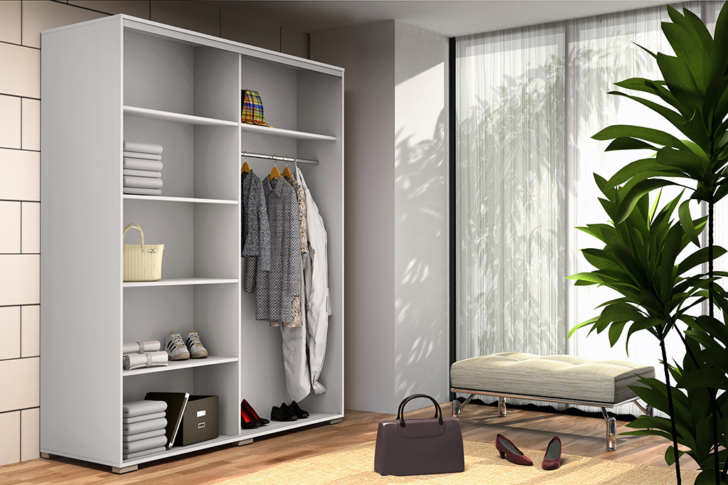 Szafa posiada drzwi przesuwne, obydwa fronty posiadają po 25cm lustra oraz po dwa pasy szkła LACOBEL. Wykonana jest z płyty laminowanej o grubości 16mm. Posiada system drzwi przesuwnych LAGUNA, dolne prowadnice jak i uchwyt wzdłuż drzwi wykonane są z ALUMINIUM.