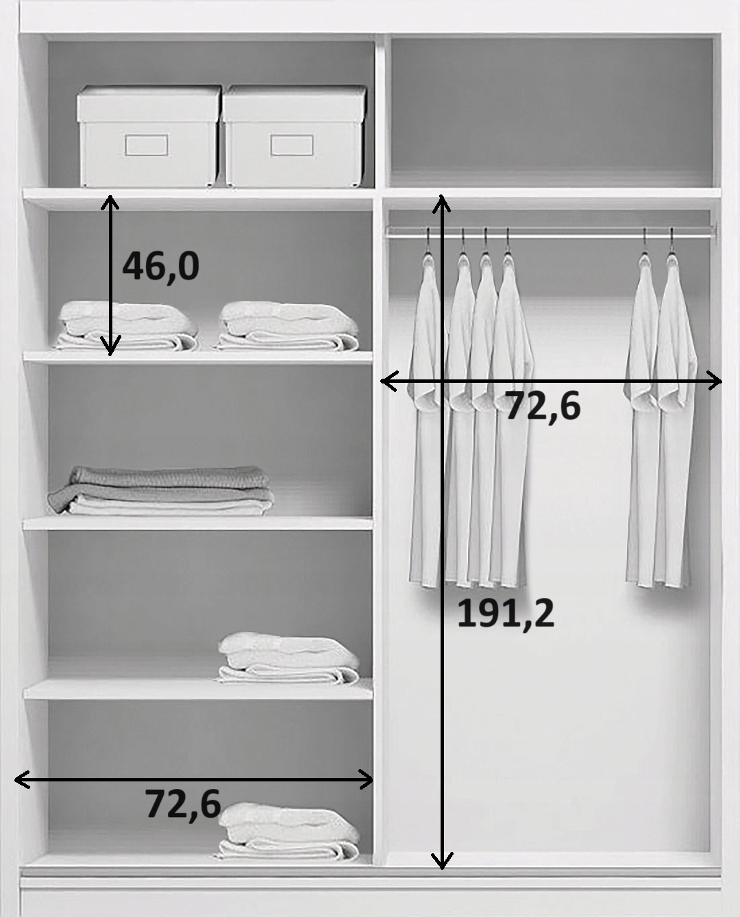 Szafa posiada drzwi przesuwne, które posiadają lustro na jednym froncie oraz 5/6 pasów lacobel na drugim. Wykonana jest z płyty laminowanej o grubości 16mm. Posiada system drzwi przesuwnych LAGUNA, dolne prowadnice jak i uchwyt wzdłuż drzwi wykonane są z ALUMINIUM.