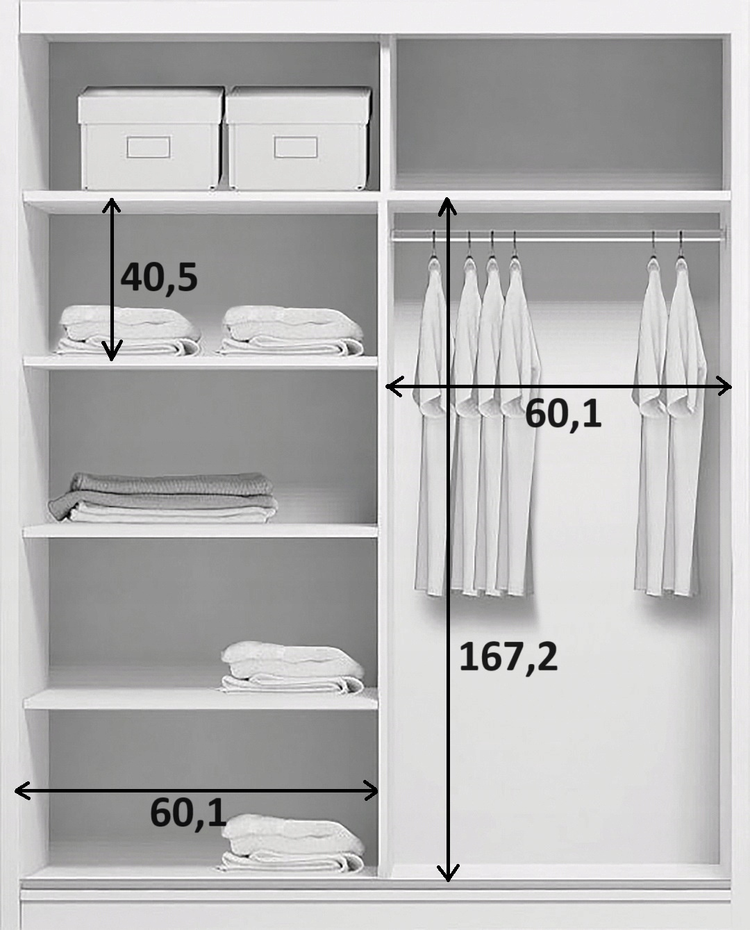 Szafa posiada drzwi przesuwne, z lustrem na jednym froncie i trzy listewki PCV czarne na drugim. Wykonana jest z płyty laminowanej o grubości 16mm. Posiada system drzwi przesuwnych LAGUNA, dolne prowadnice jak i uchwyt wzdłuż drzwi wykonane są z ALUMINIUM.