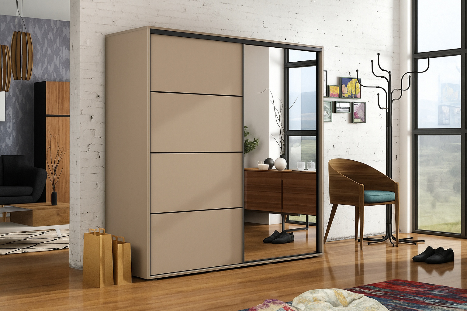 Szafa posiada drzwi przesuwne, z lustrem na jednym froncie i trzy listewki PCV czarne na drugim. Wykonana jest z płyty laminowanej o grubości 16mm. Posiada system drzwi przesuwnych LAGUNA, dolne prowadnice jak i uchwyt wzdłuż drzwi wykonane są z ALUMINIUM.
