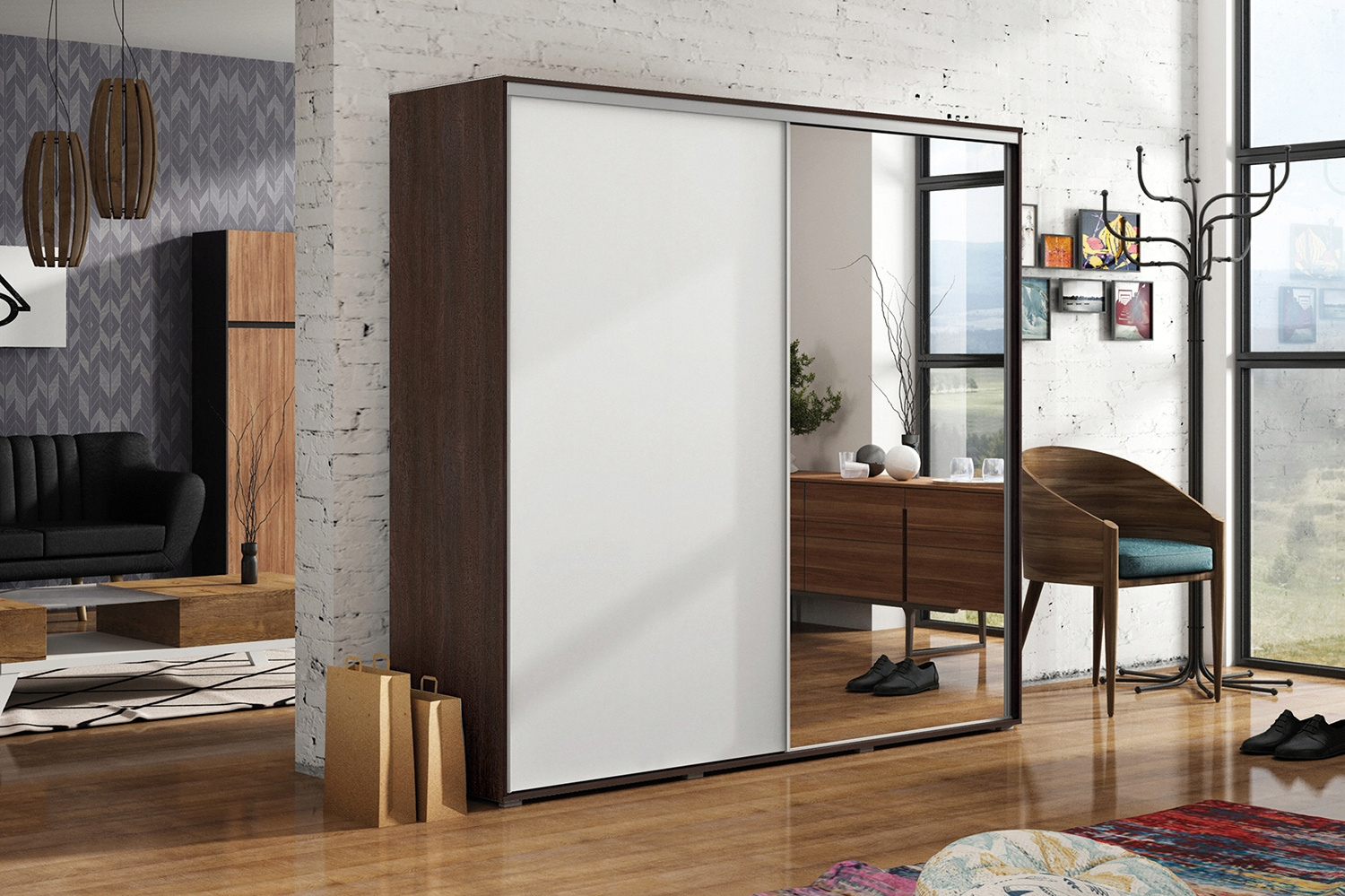 Szafa posiada drzwi przesuwne, z lustrem na jednym froncie. Wykonana jest z płyty laminowanej o grubości 16mm. Posiada system drzwi przesuwnych LAGUNA, dolne prowadnice jak i uchwyt wzdłuż drzwi wykonane są z ALUMINIUM.