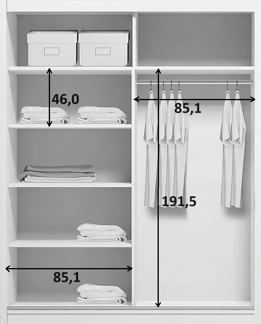Szafa posiada drzwi przesuwne, z lustrem na jednym froncie. Wykonana jest z płyty laminowanej o grubości 16mm. Posiada system drzwi przesuwnych LAGUNA, dolne prowadnice jak i uchwyt wzdłuż drzwi wykonane są z ALUMINIUM.