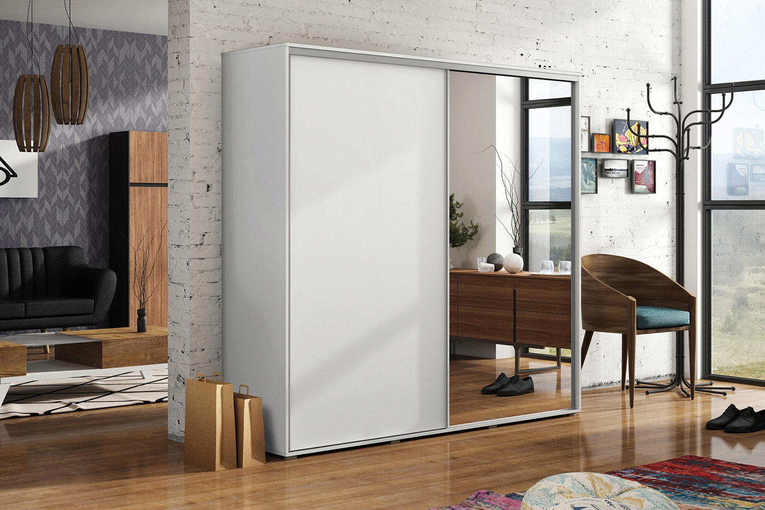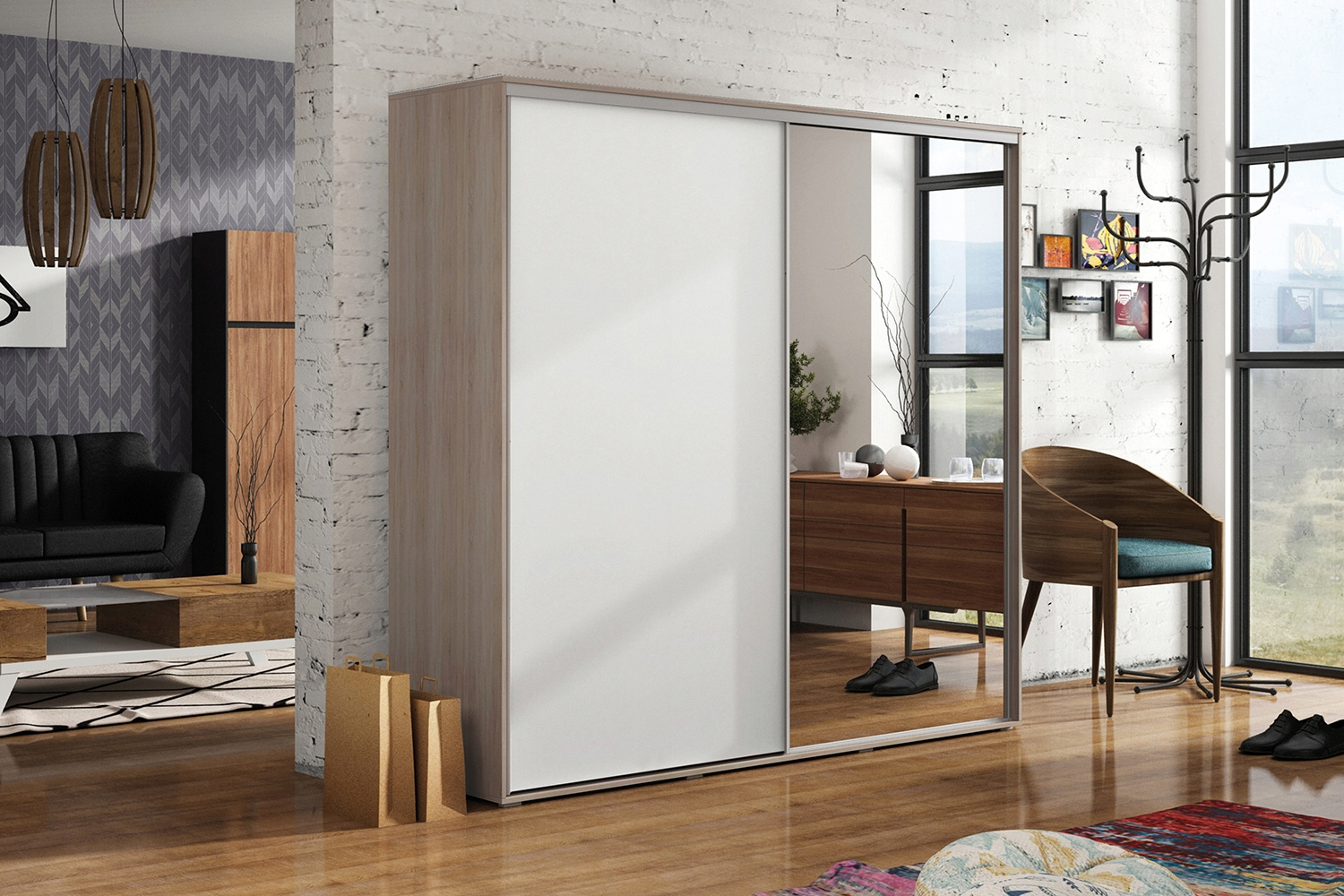 Szafa A20 posiada drzwi przesuwne po jednej stronie wyklejone lustrem. Wykonana jest z płyty laminowanej o grubości 16mm.