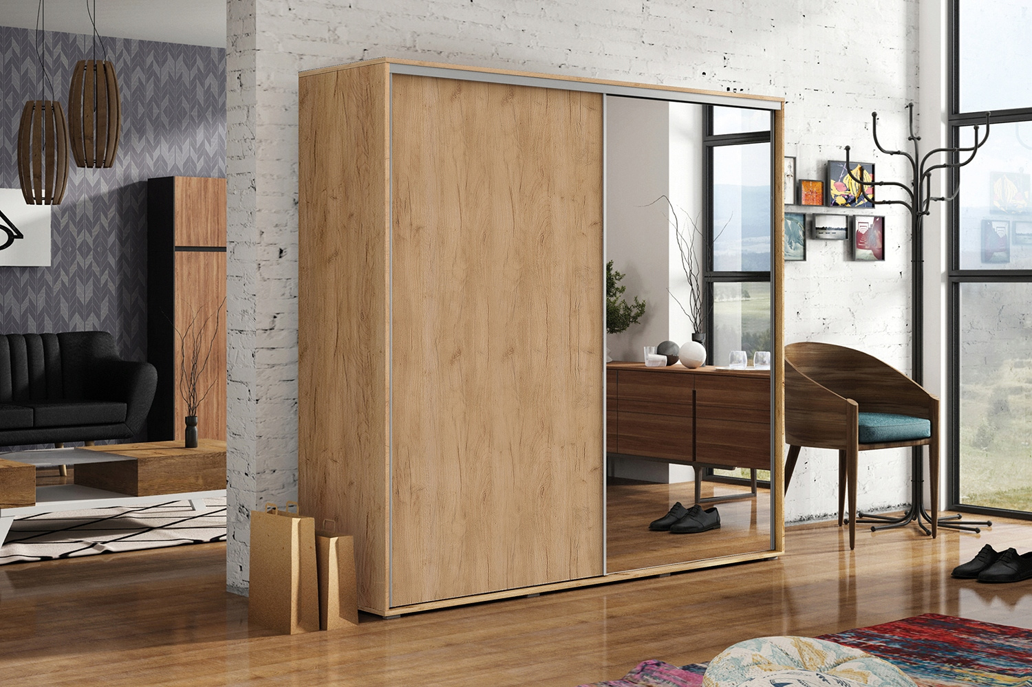 Szafa posiada drzwi przesuwne, z lustrem na jednym froncie. Wykonana jest z płyty laminowanej o grubości 16mm. Posiada system drzwi przesuwnych LAGUNA, dolne prowadnice jak i uchwyt wzdłuż drzwi wykonane są z ALUMINIUM.