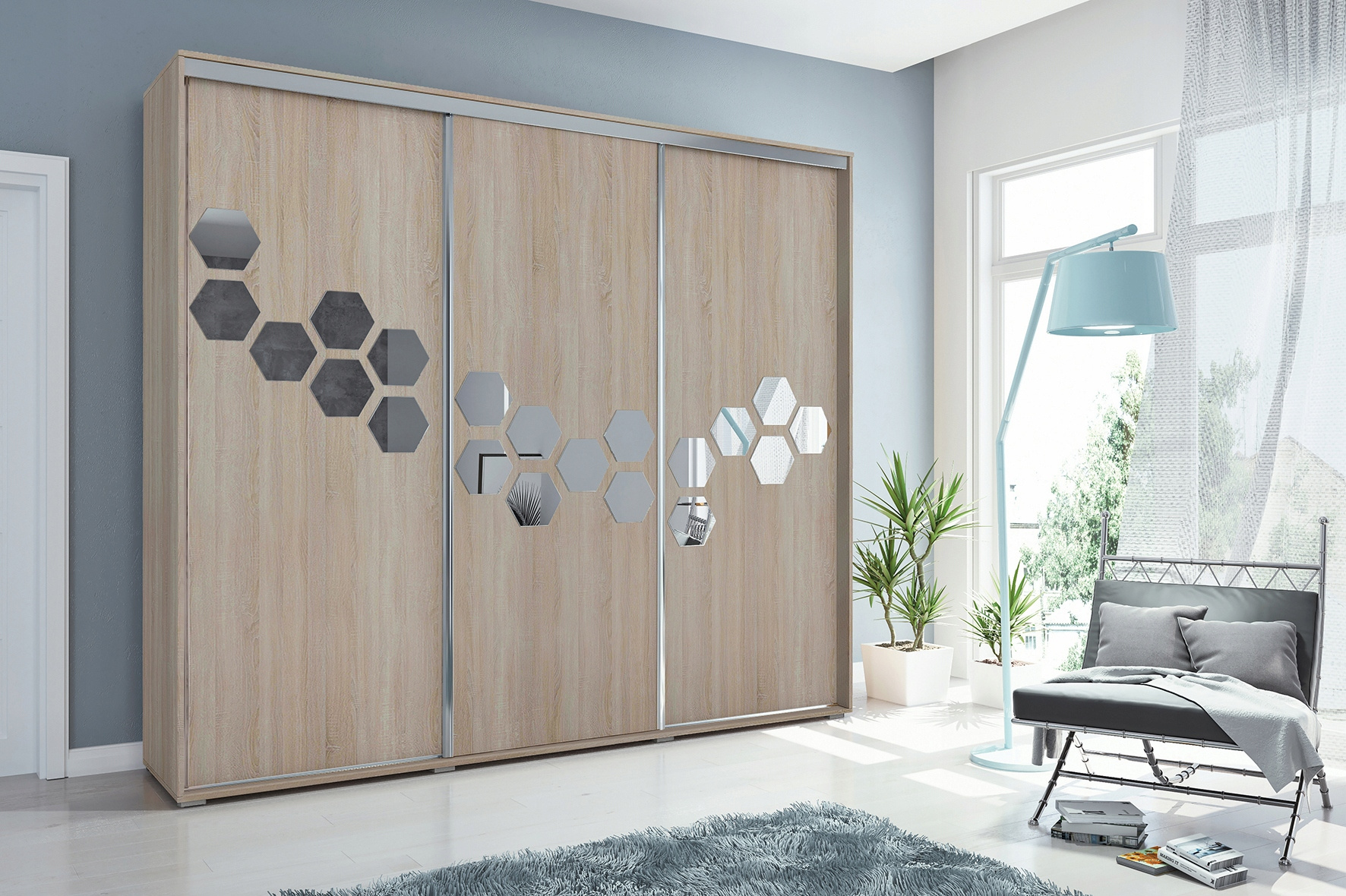 Szafa posiada drzwi przesuwne, plastry miodu na wszystkich frontach. Wykonana jest z płyty laminowanej o grubości 16mm. Posiada system drzwi przesuwnych LAGUNA, dolne prowadnice jak i uchwyt wzdłuż drzwi wykonane są z ALUMINIUM.