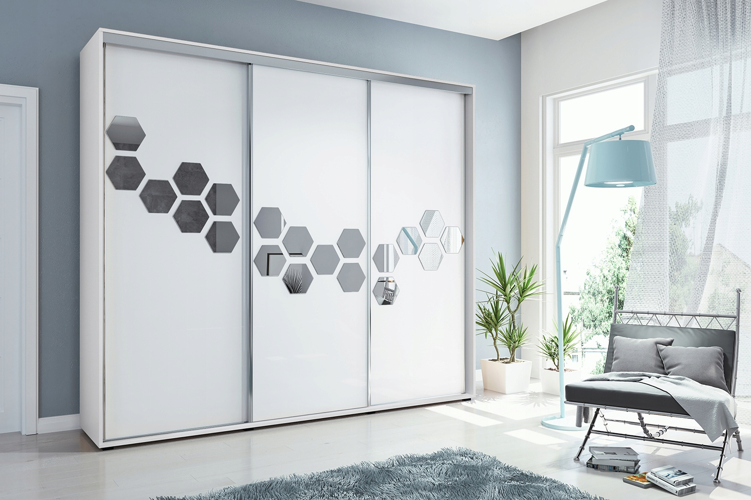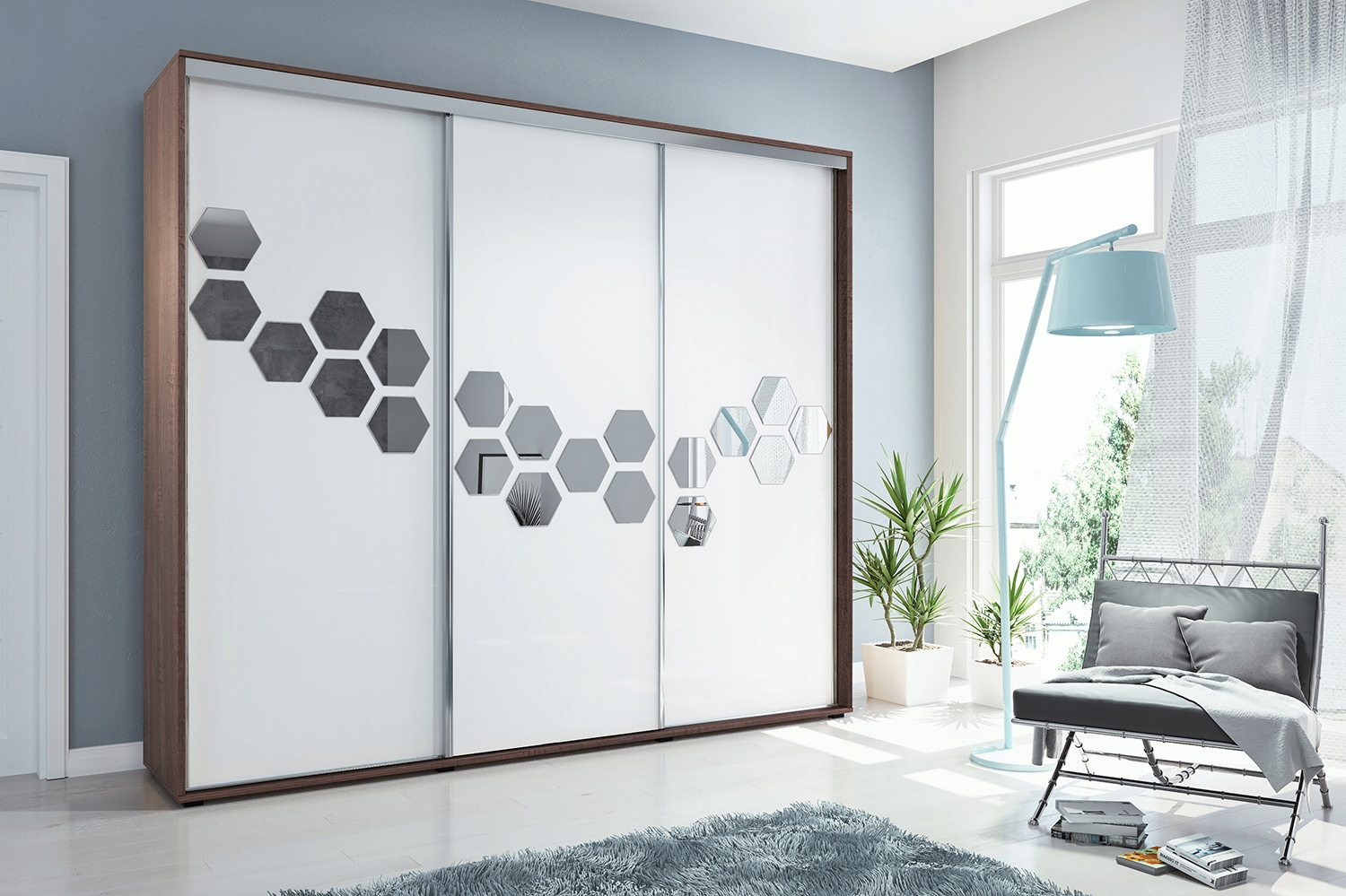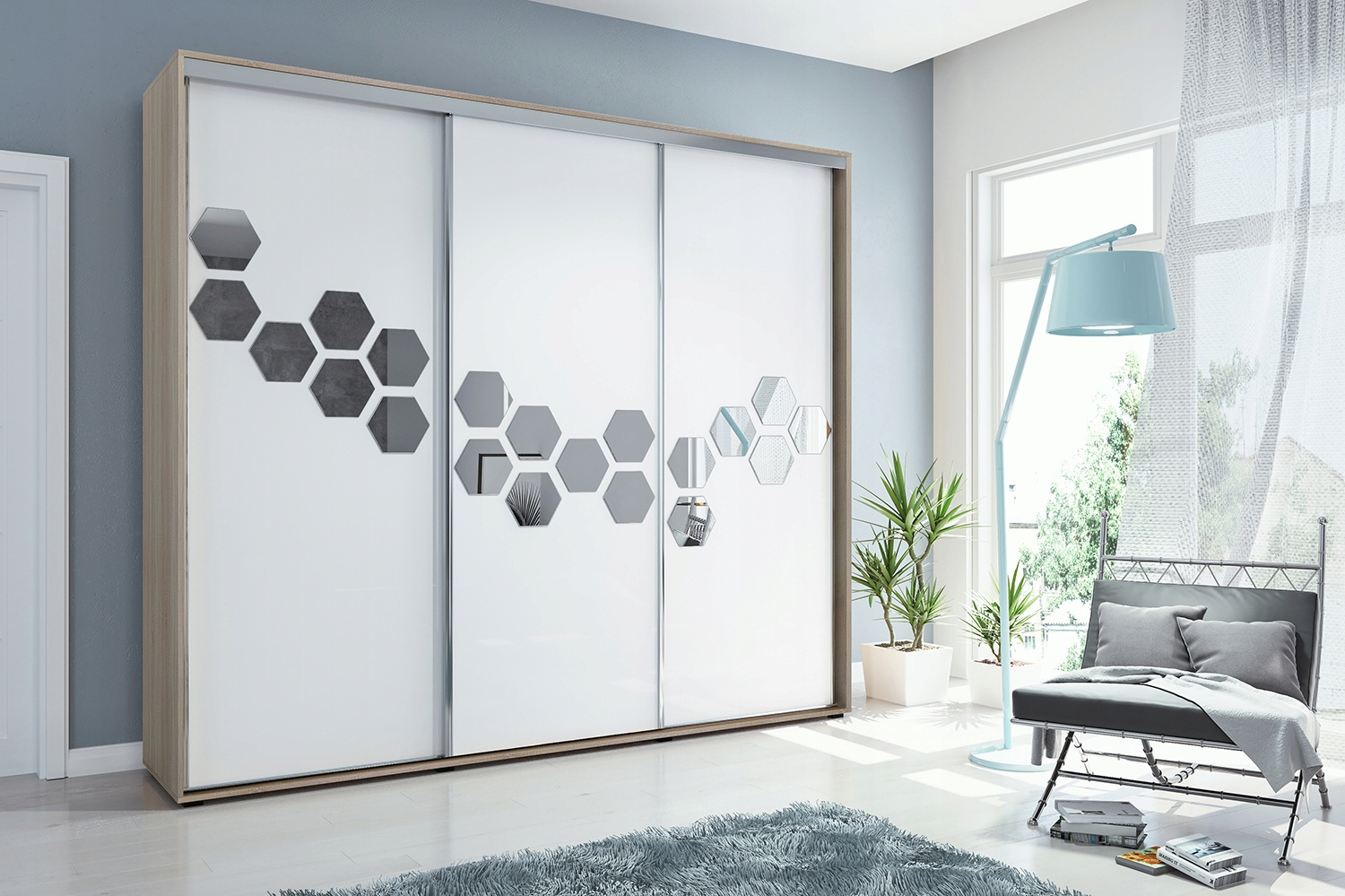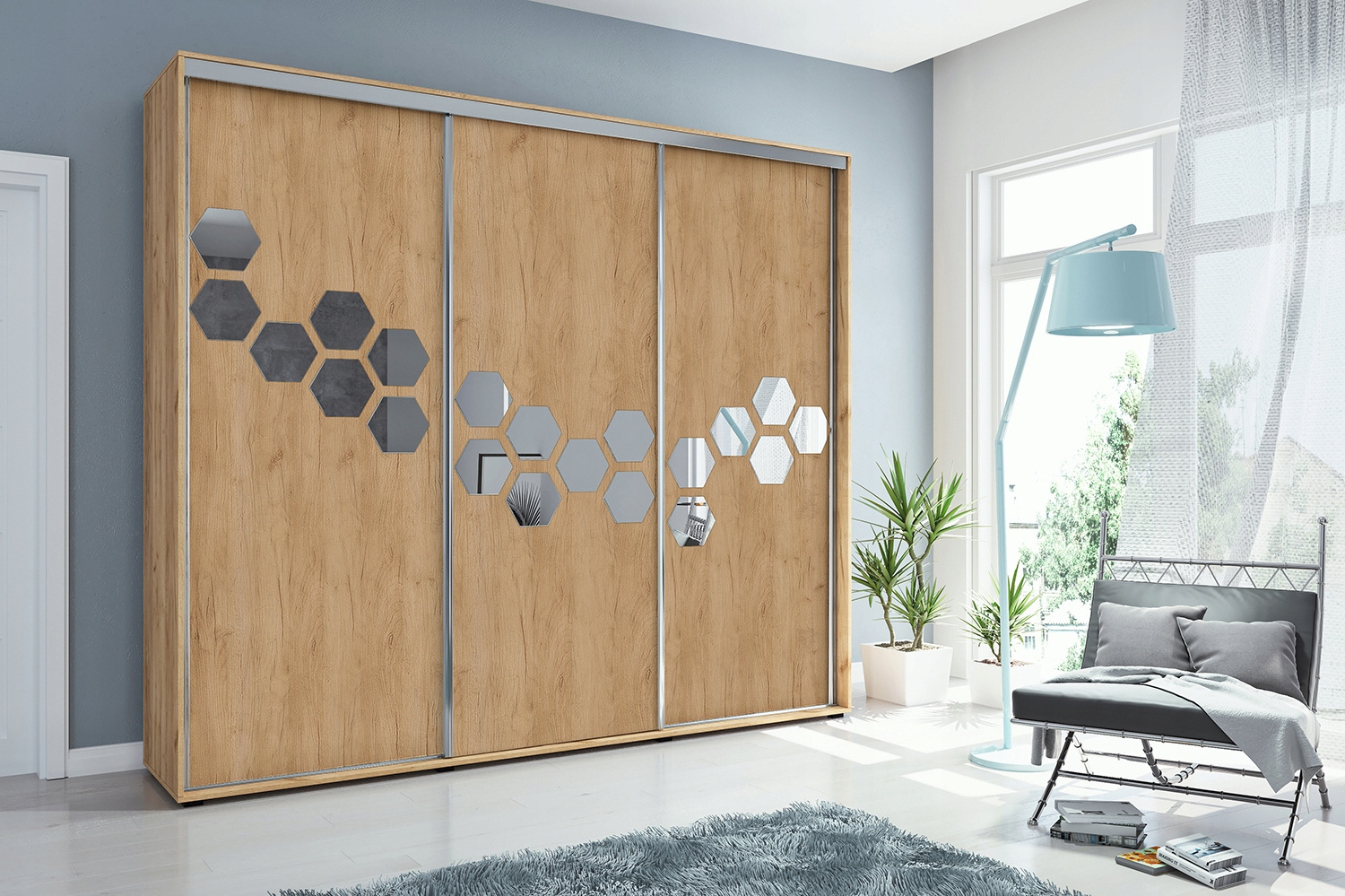 Szafa posiada drzwi przesuwne, plastry miodu na wszystkich frontach. Wykonana jest z płyty laminowanej o grubości 16mm. Posiada system drzwi przesuwnych LAGUNA, dolne prowadnice jak i uchwyt wzdłuż drzwi wykonane są z ALUMINIUM.