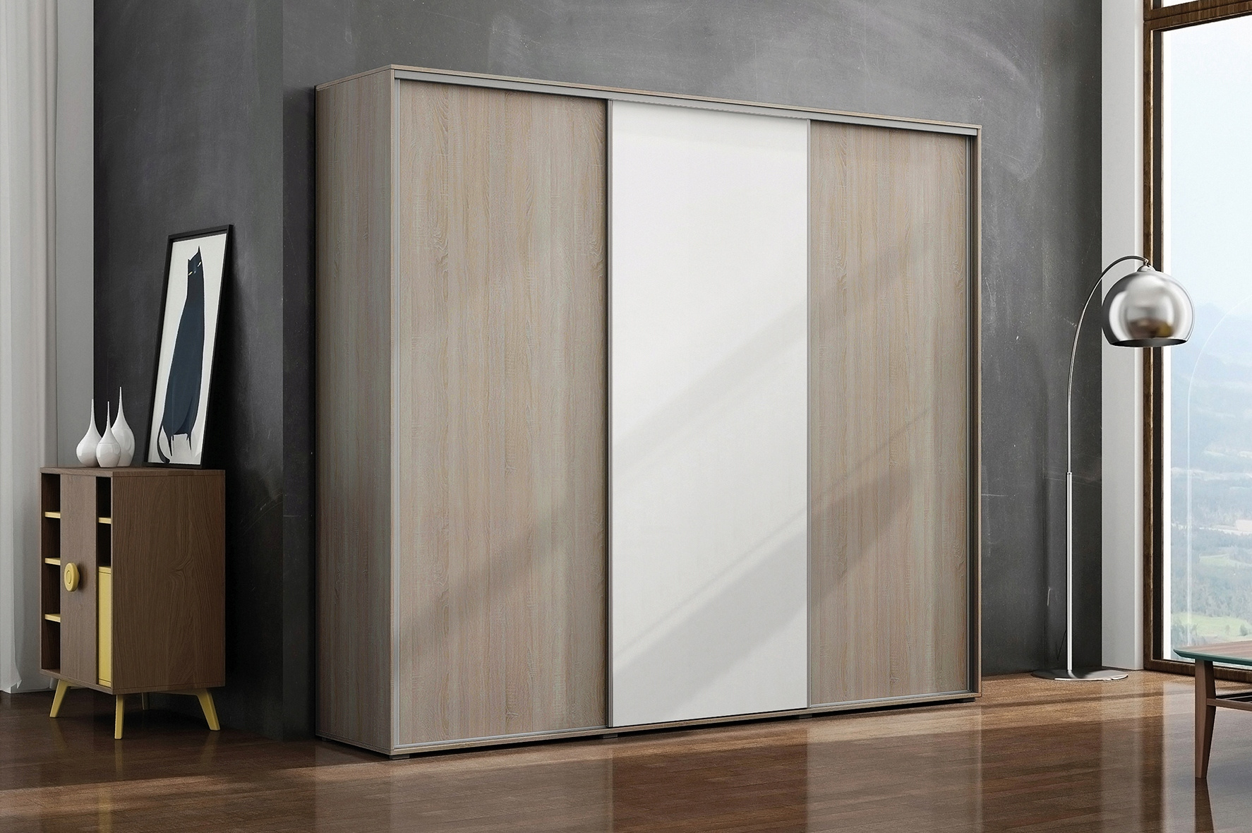 Szafa posiada drzwi przesuwne, fronty bez dekoracji. Wykonana jest z płyty laminowanej o grubości 16mm. Posiada system drzwi przesuwnych LAGUNA, dolne prowadnice jak i uchwyt wzdłuż drzwi wykonane są z ALUMINIUM.