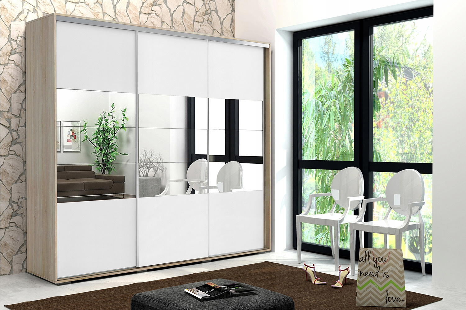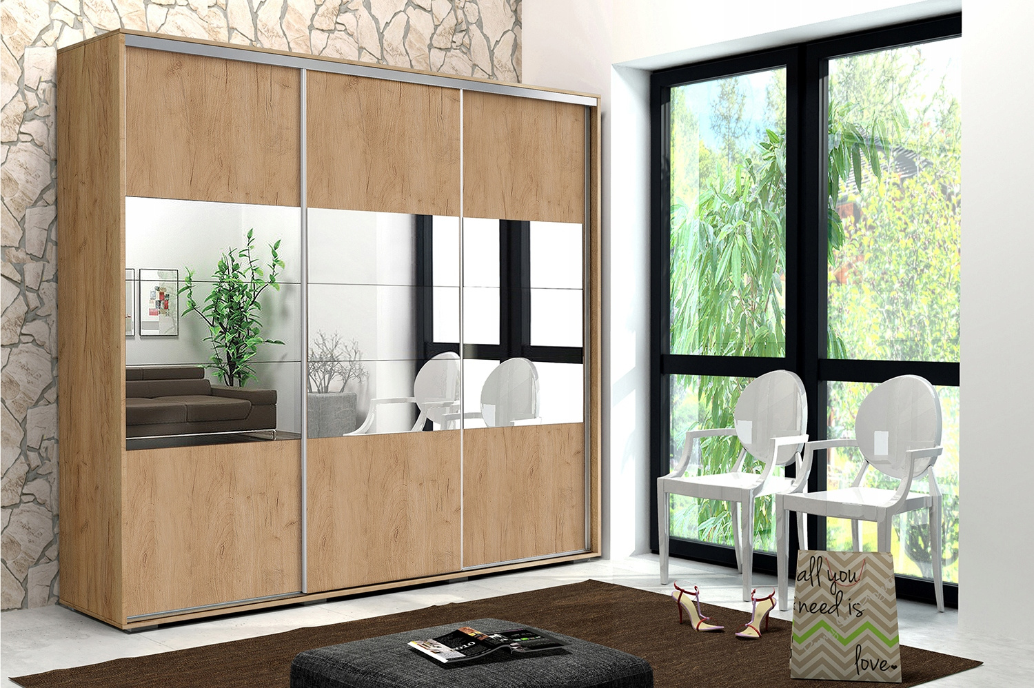 Szafa posiada trzy fronty, które posiadają po trzy pasy luster 0,4m na każdym. Wykonana jest z płyty laminowanej o grubości 16mm. Posiada system drzwi przesuwnych LAGUNA, dolne prowadnice jak i uchwyt wzdłuż drzwi wykonane są z ALUMINIUM.