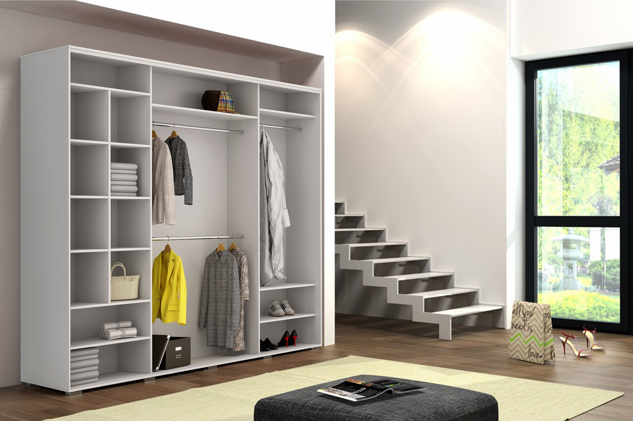 Szafa posiada trzy fronty, które posiadają po jednym pasie lustra 0,25m na każdym. Wykonana jest z płyty laminowanej o grubości 16mm. Posiada system drzwi przesuwnych LAGUNA, dolne prowadnice jak i uchwyt wzdłuż drzwi wykonane są z ALUMINIUM.