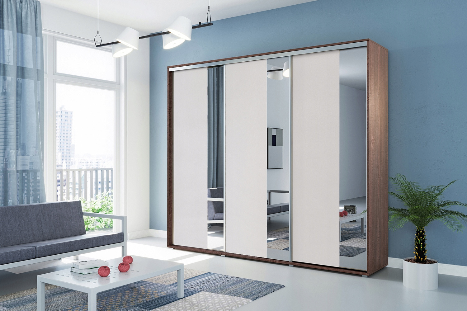 Szafa posiada trzy fronty, które posiadają po jednym pionowym pasie lustra 0,25m. Wykonana jest z płyty laminowanej o grubości 16mm. Posiada system drzwi przesuwnych LAGUNA, dolne prowadnice jak i uchwyt wzdłuż drzwi wykonane są z ALUMINIUM.