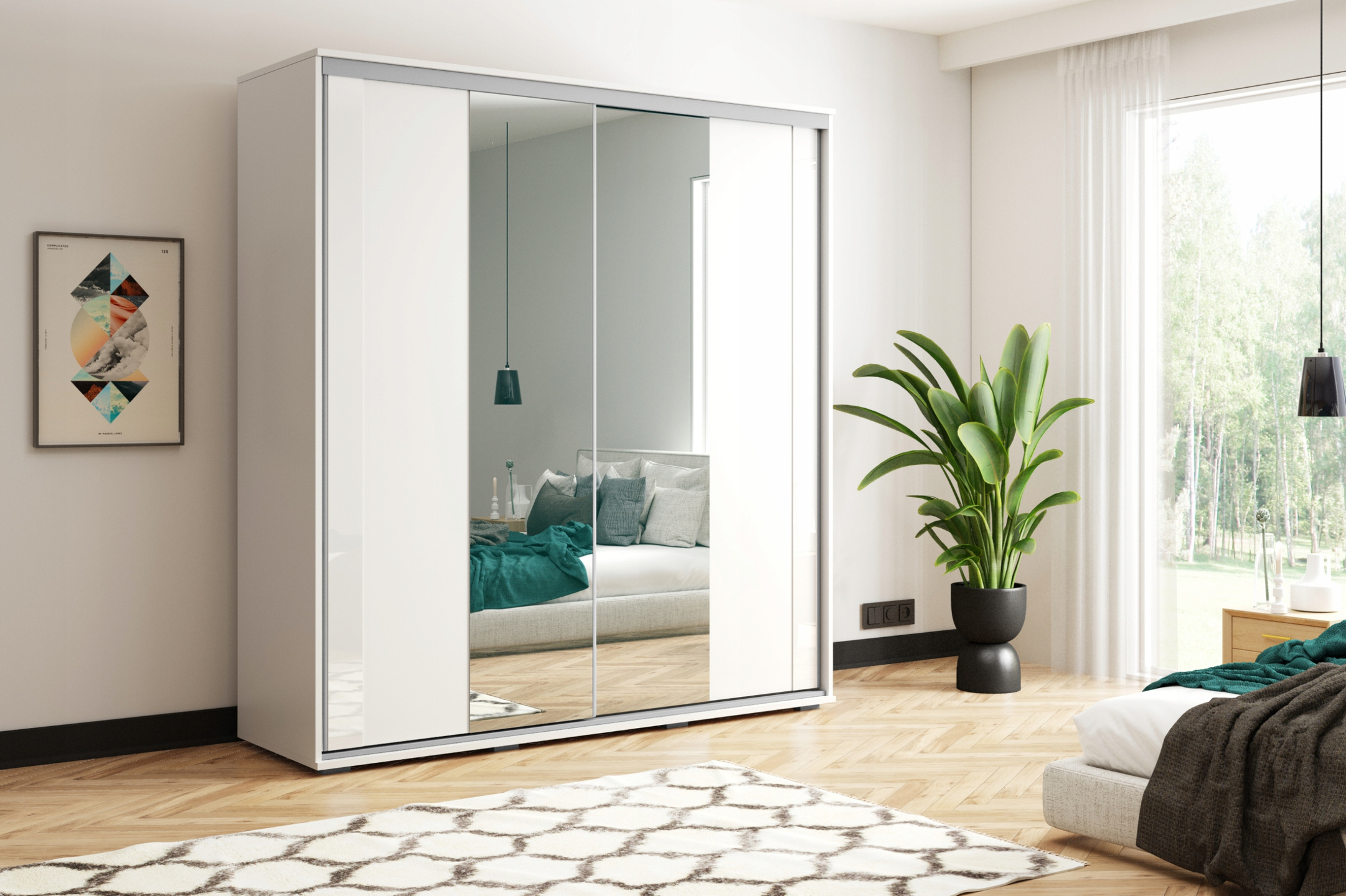 Szafa posiada drzwi przesuwne, które posiadają po jednym pasie lustra na obu frontach. Wykonana jest z płyty laminowanej o grubości 16mm. Posiada system drzwi przesuwnych LAGUNA, dolne prowadnice jak i uchwyt wzdłuż drzwi wykonane są z ALUMINIUM.