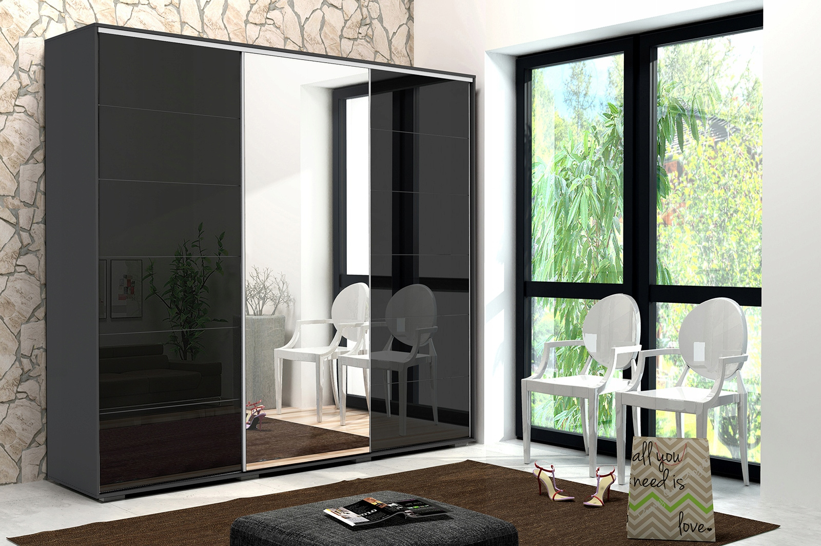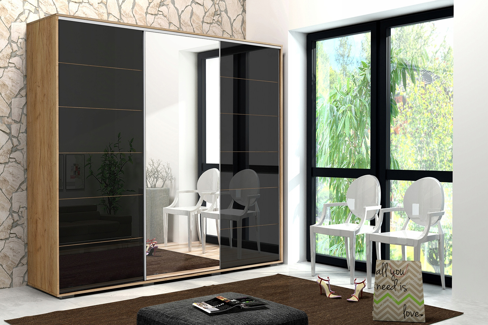 Szafa A32 to szafa trzydrzwiowa z dwoma frontami ze szkłem lacobel oaz środkowym frontem wyklejonym lustrem. Wykonana jest z płyty laminowanej o grubości 16mm. Posiada system drzwi przesuwnych LAGUNA, dolne prowadnice jak i uchwyt wzdłuż drzwi wykonane są z ALUMINIUM.