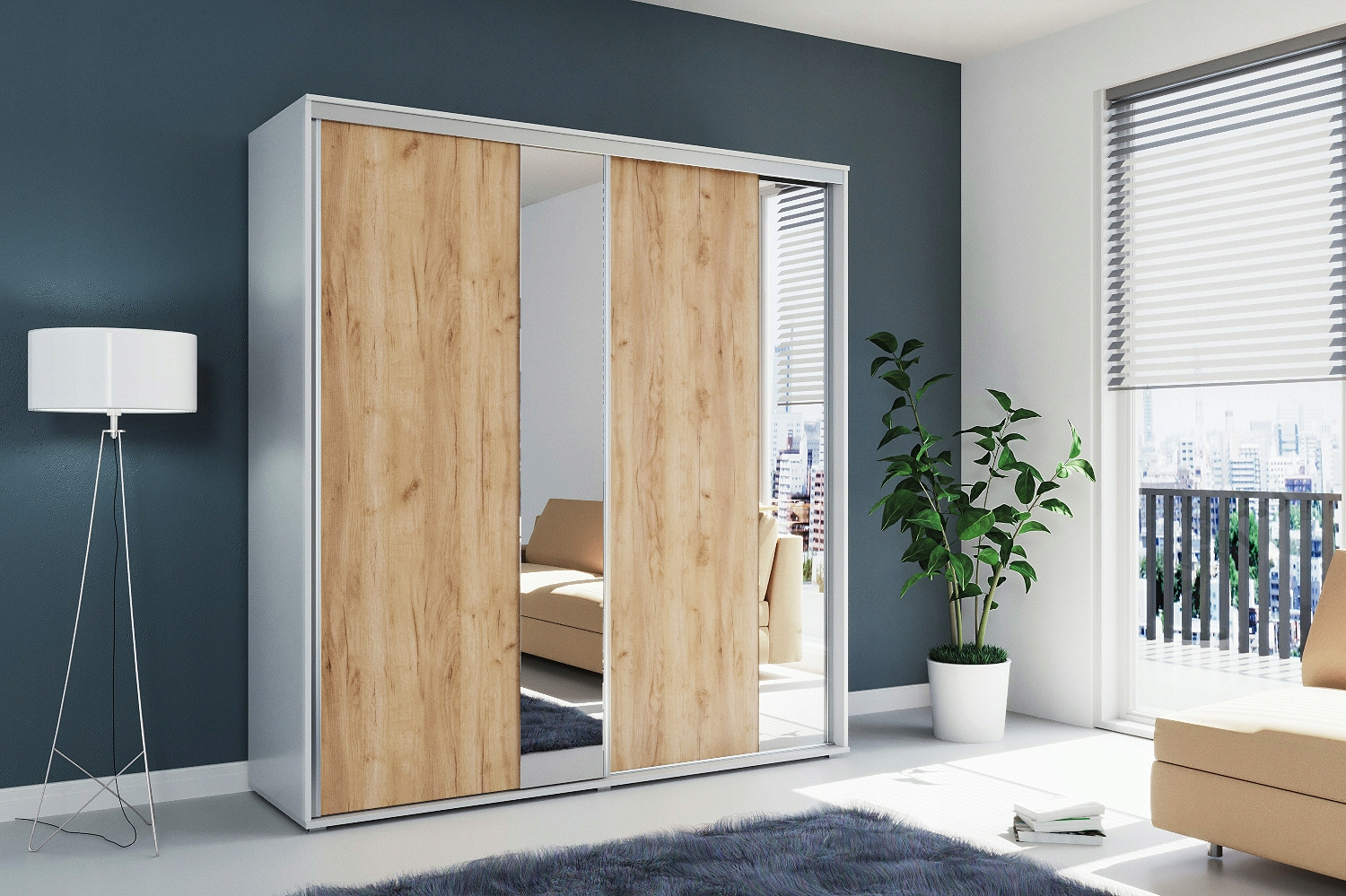 Szafa posiada drzwi przesuwne, które posiadają po jednym pasie lustra 0,25m na obu frontach. Wykonana jest z płyty laminowanej o grubości 16mm. Posiada system drzwi przesuwnych LAGUNA, dolne prowadnice jak i uchwyt wzdłuż drzwi wykonane są z ALUMINIUM.