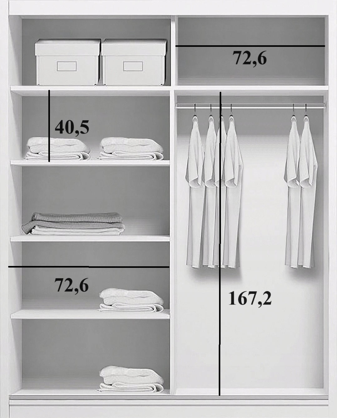 Szafa posiada drzwi przesuwne, które posiadają po jednym pionowym pasie lustra na obu frontach. Wykonana jest z płyty laminowanej o grubości 16mm. Posiada system drzwi przesuwnych LAGUNA, dolne prowadnice jak i uchwyt wzdłuż drzwi wykonane są z ALUMINIUM.