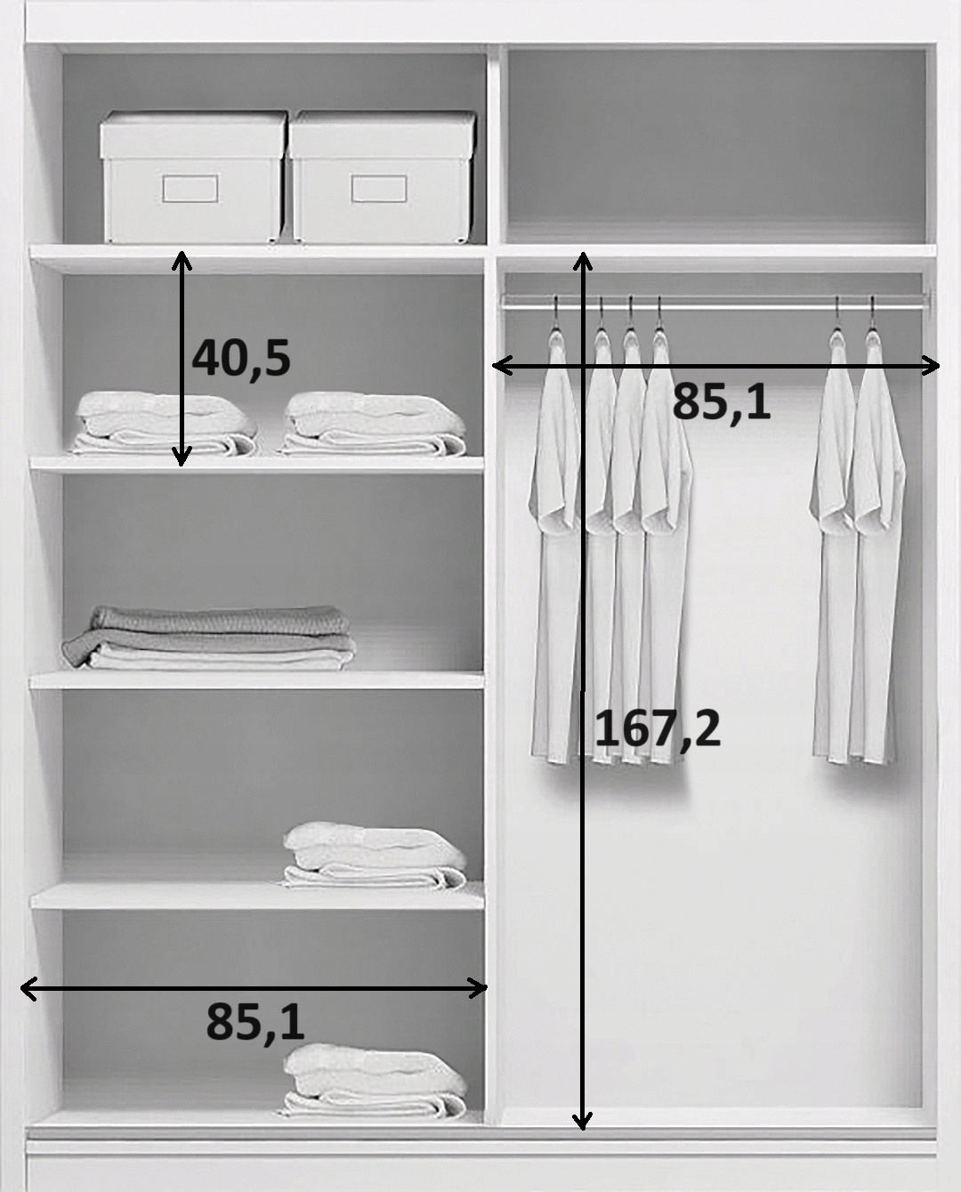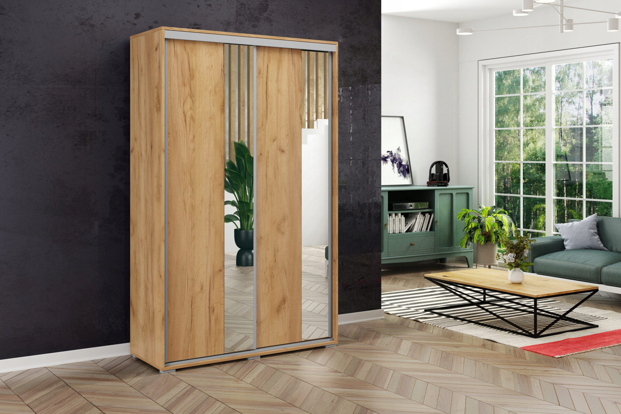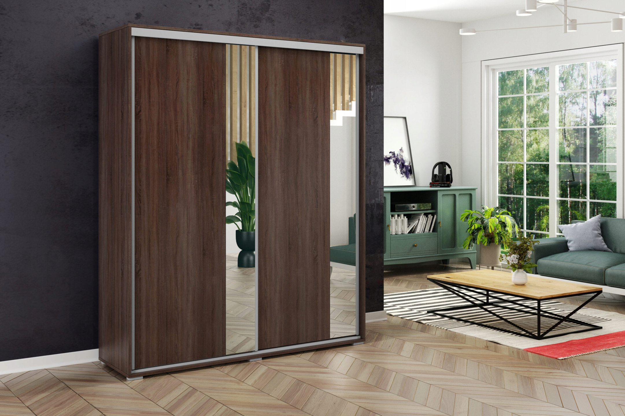 Szafa posiada drzwi przesuwne, które posiadają po jednym pionowym pasie lustra na obu frontach. Wykonana jest z płyty laminowanej o grubości 16mm. Posiada system drzwi przesuwnych LAGUNA, dolne prowadnice jak i uchwyt wzdłuż drzwi wykonane są z ALUMINIUM.