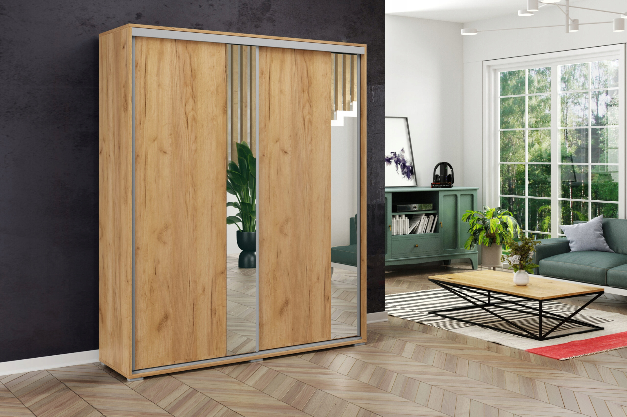 Szafa posiada drzwi przesuwne, które posiadają po jednym pionowym pasie lustra na obu frontach. Wykonana jest z płyty laminowanej o grubości 16mm. Posiada system drzwi przesuwnych LAGUNA, dolne prowadnice jak i uchwyt wzdłuż drzwi wykonane są z ALUMINIUM.