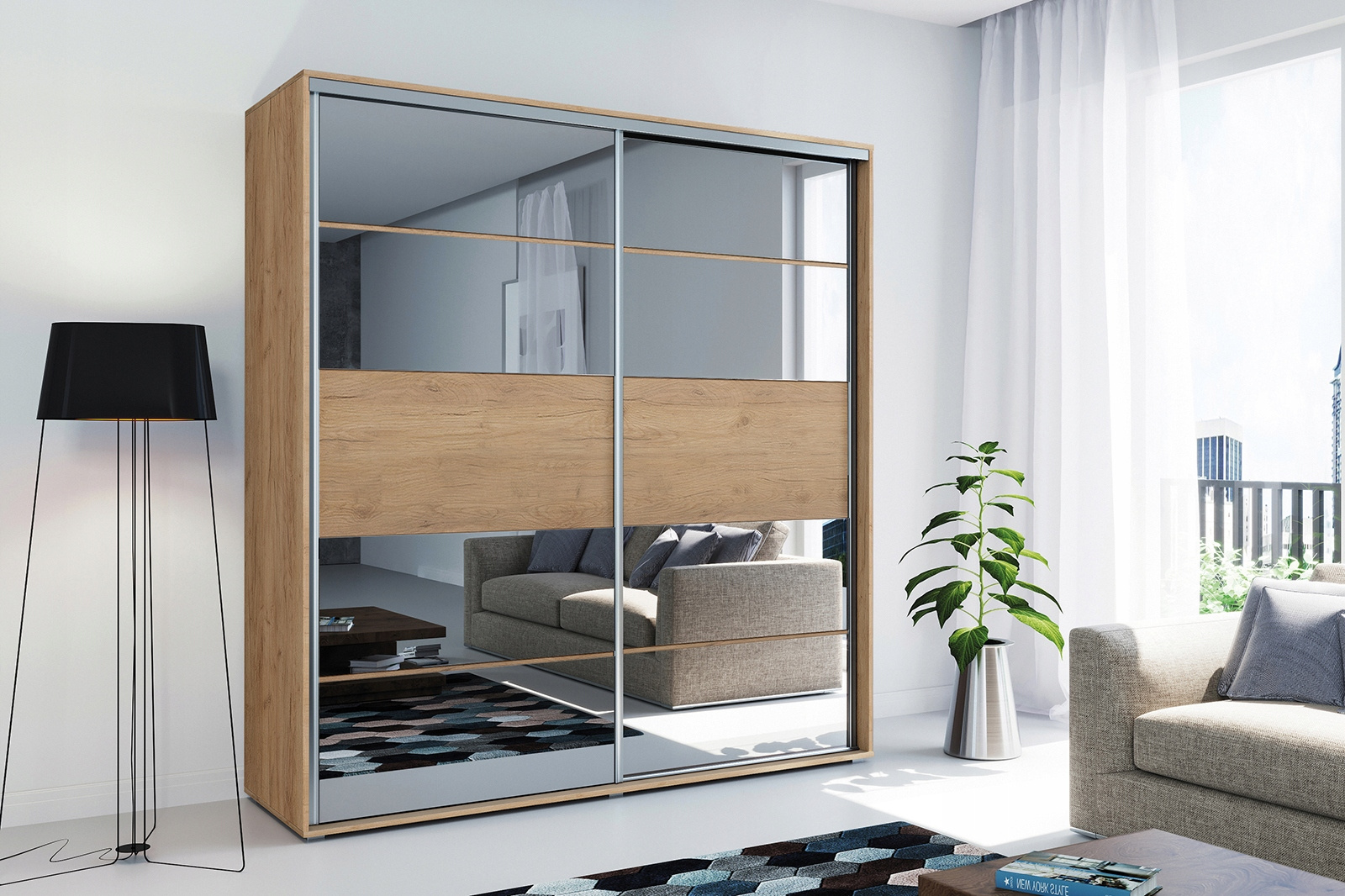 Szafa posiada drzwi przesuwne, które posiadają po cztery pasy luster 0,4 na obu frontach. Wykonana jest z płyty laminowanej o grubości 16mm. Posiada system drzwi przesuwnych LAGUNA, dolne prowadnice jak i uchwyt wzdłuż drzwi wykonane są z ALUMINIUM.