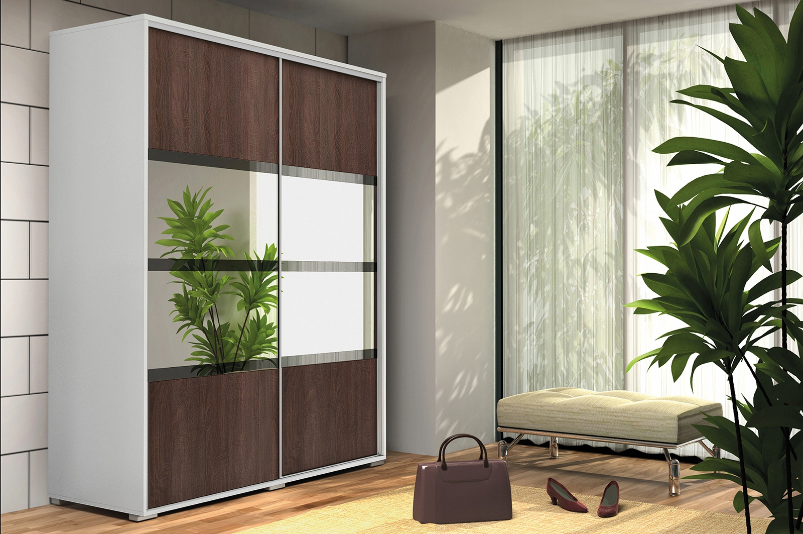 Szafa posiada drzwi przesuwne, fronty posiadają po dwa pasy luster 0,4 + trzy paski szkła LACOBEL 0,1. Wykonana jest z płyty laminowanej o grubości 16mm. Posiada system drzwi przesuwnych LAGUNA, dolne prowadnice jak i uchwyt wzdłuż drzwi wykonane są z ALUMINIUM.