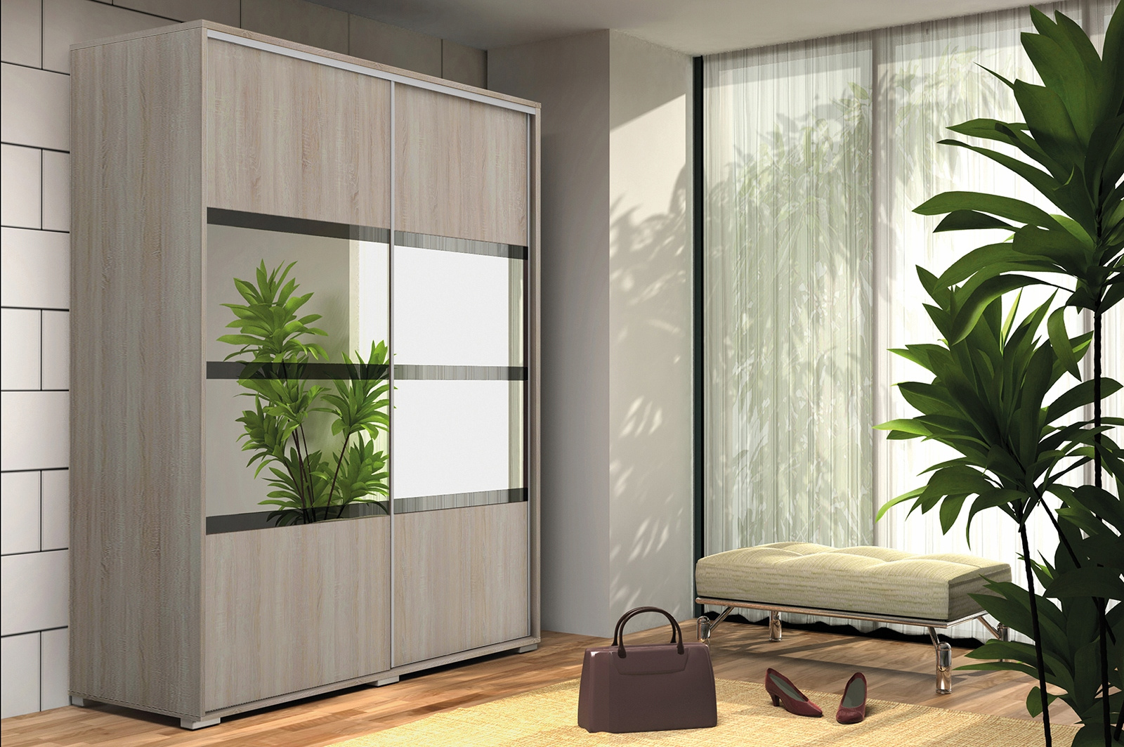 Szafa posiada drzwi przesuwne, fronty posiadają po dwa pasy luster 0,4 + trzy paski szkła LACOBEL 0,1. Wykonana jest z płyty laminowanej o grubości 16mm. Posiada system drzwi przesuwnych LAGUNA, dolne prowadnice jak i uchwyt wzdłuż drzwi wykonane są z ALUMINIUM.