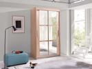 Szafa posiada dwa przesuwne fronty. Wewnątrz po lewej stronie znajduje się drążek na wieszaki, a po prawej stronie półki. Szafa dostępna w dwóch kolorach oraz w wersji z lustrami. Doskonale sprawdzi się w salonie, ale również w sypialni, przedpokoju czy pokoju młodzieżowym.