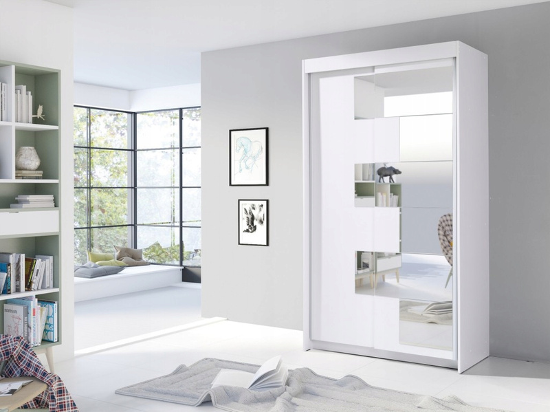 Szafa posiada dwa przesuwne fronty z lustrami. Wewnątrz po lewej stronie znajduje się drążek na wieszaki a z prawej strony półki. Doskonale sprawdzi się w salonie, ale również w sypialni, przedpokoju czy pokoju młodzieżowym.