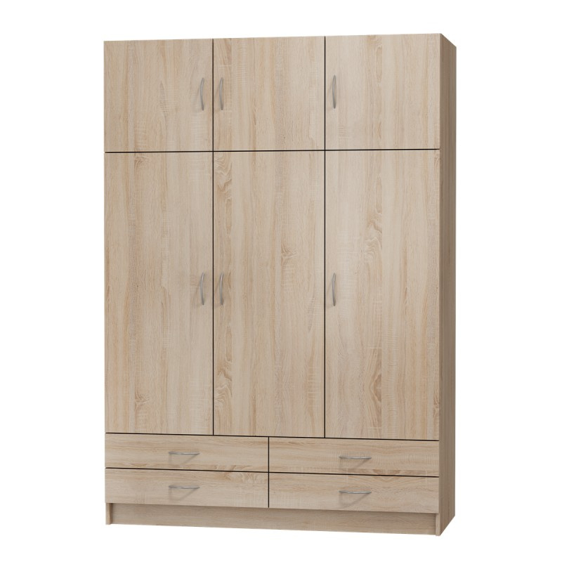 Szafa posiada drzwi uchylne, wewnątrz znajdują się półki jak i drążek.