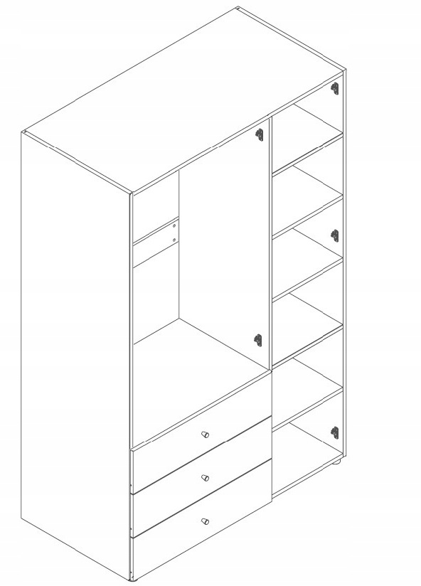 Szafa posiada trzy uchylne fronty oraz trzy szuflady. W lewej części (nad szufladami) znajduje się drążek, a w prawej części półki.