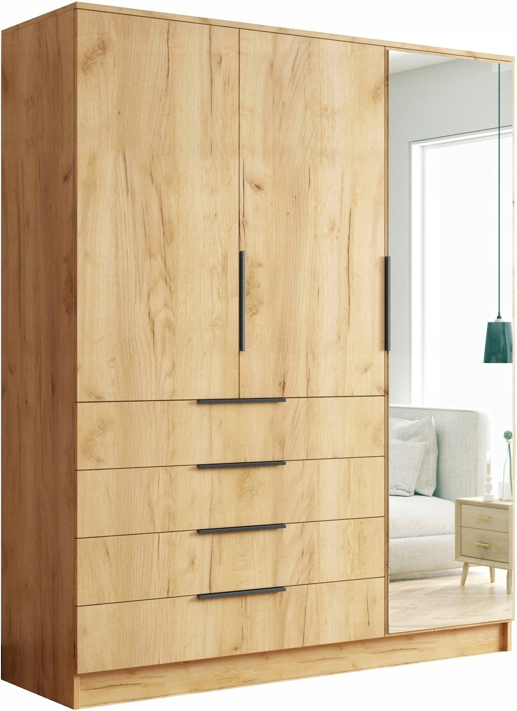 Szafa posiada drzwi uchylne - jeden front w całości wyklejony lustrem - oraz szuflady. Wykonana jest z płyty laminowanej o grubości 16mm.