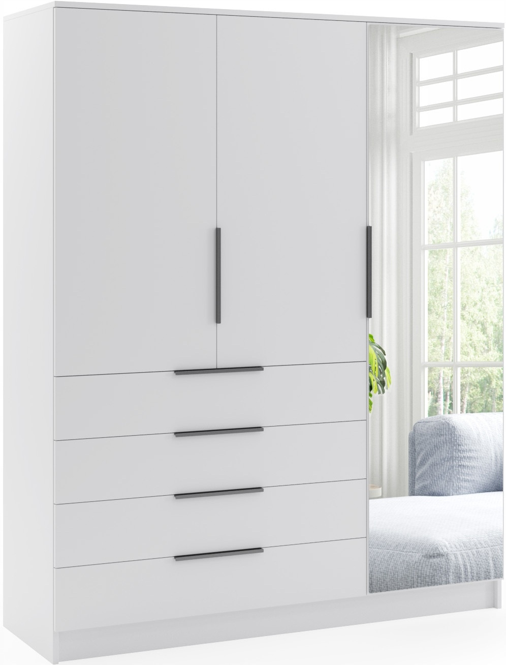 Szafa posiada drzwi uchylne - dwa fronty w całości wyklejony lustrem - oraz szuflady. Wykonana jest z płyty laminowanej o grubości 16mm.