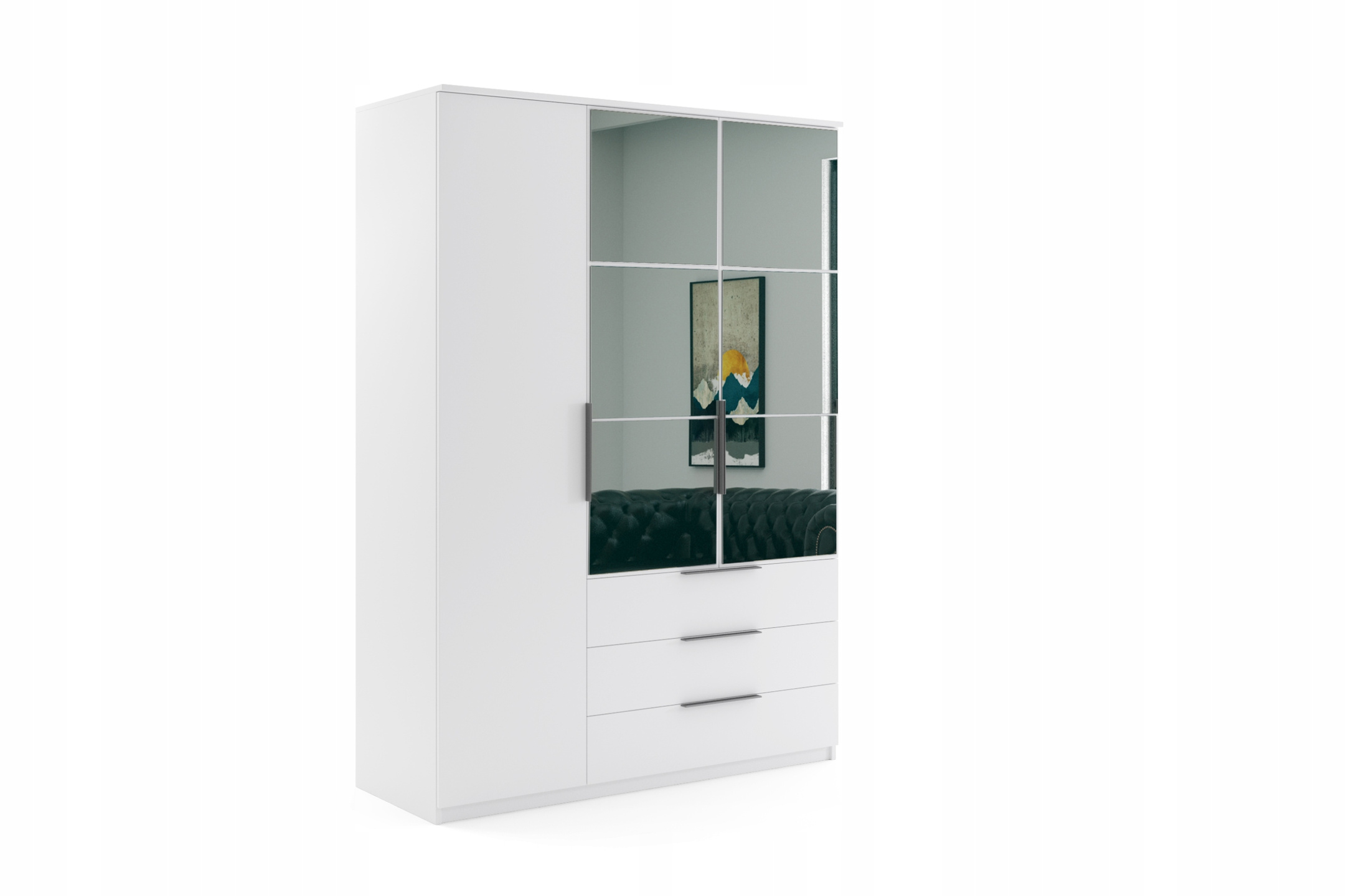 Szafa posiada drzwi uchylne - dwa fronty wyklejone lustrem - oraz trzy szuflady. Wykonana jest z płyty laminowanej o grubości 16mm.