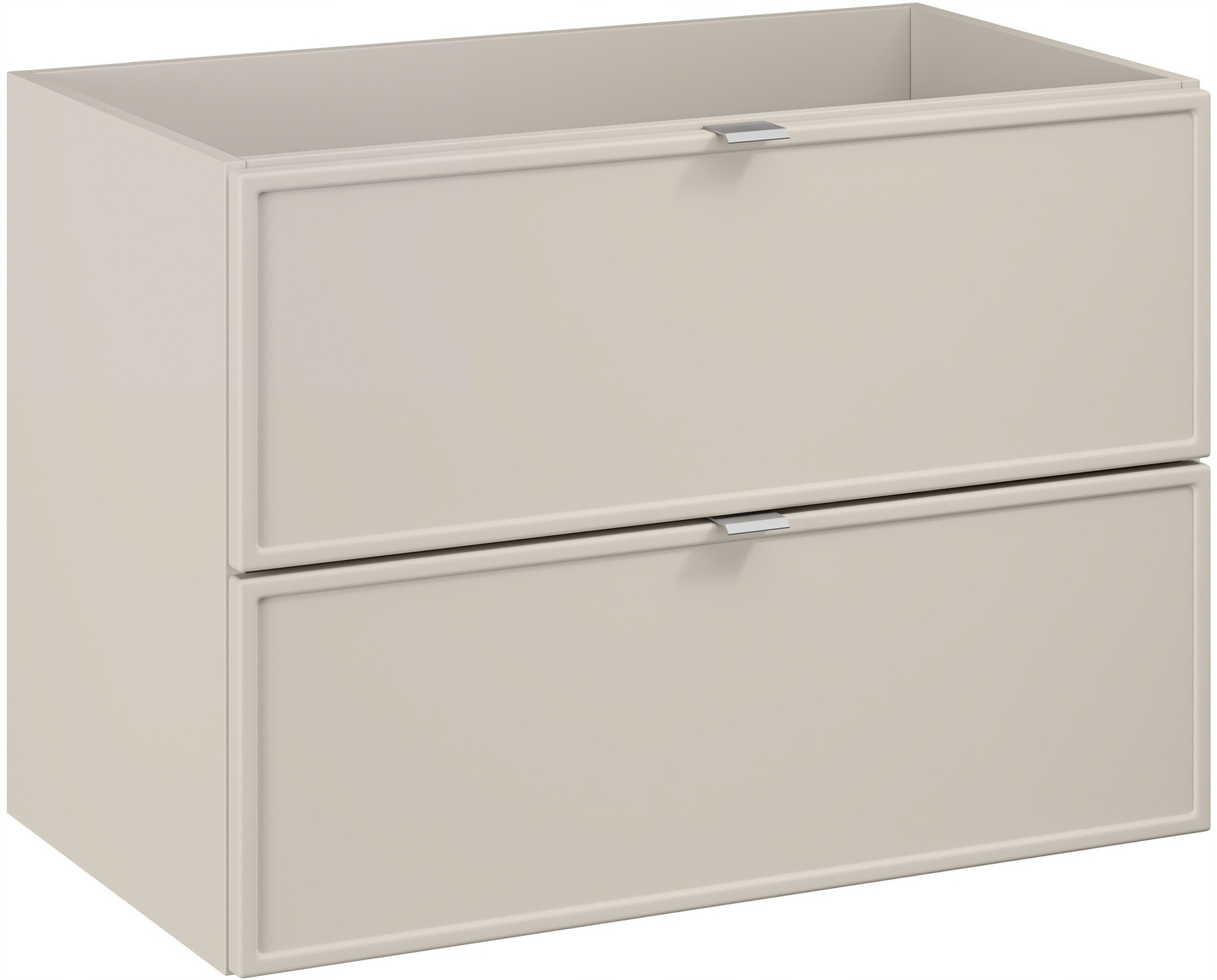 Doskonale wpisuje się w nowoczesne i klasyczne aranżacje łazienkowe. Mebel został starannie wykończony w subtelnym odcieniu kaszmiru, nadając wnętrzu łagodny, harmonijny charakter. Charakterystyczne fronty z frezowaną ramką dodają mu wyrafinowanego stylu. Uchwyty w trzech kolorach - złoty połysk, chrom połysk oraz czarny mat - nadają stylowy wygląd.