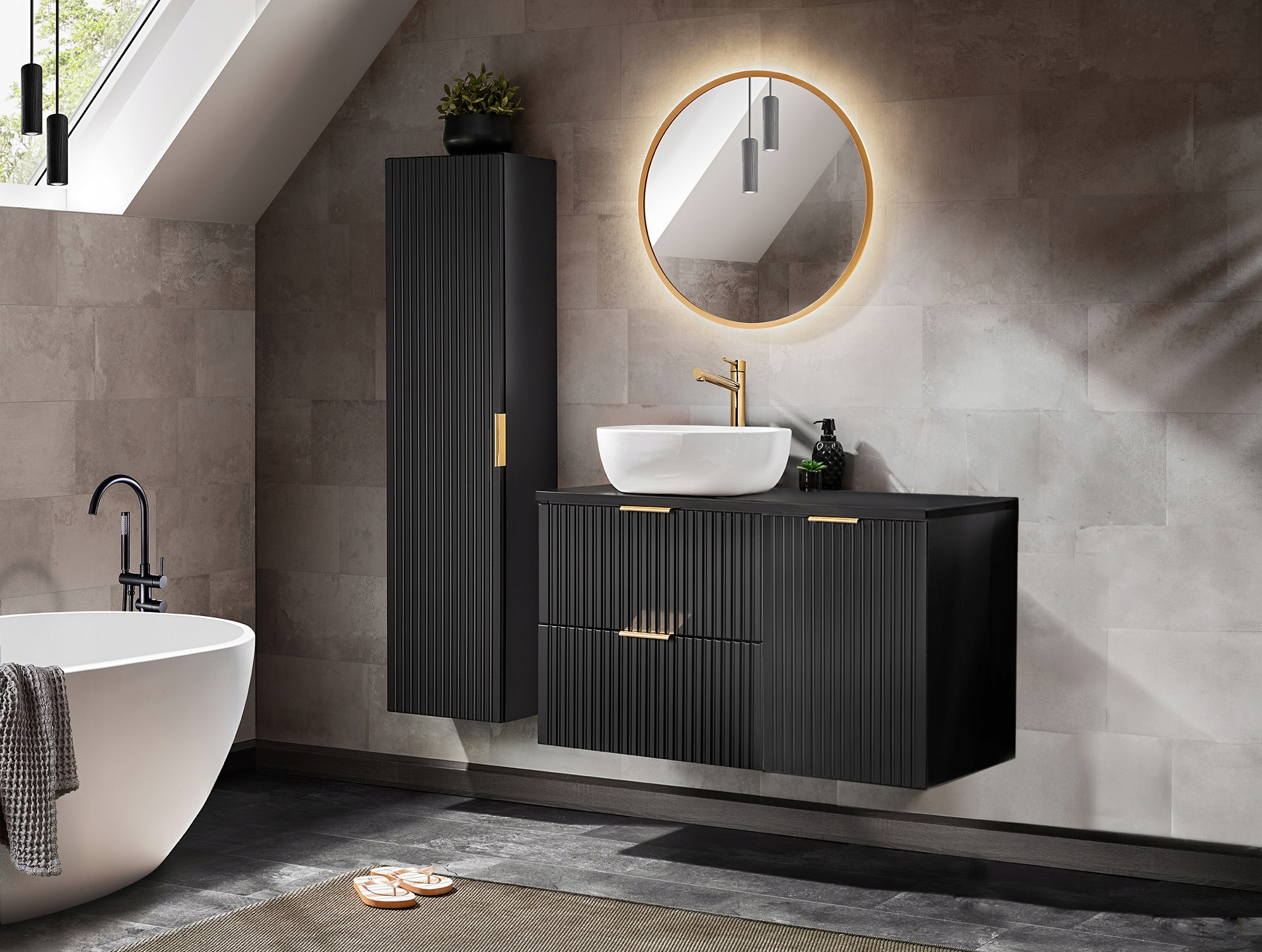Meble łazienkowe Adel łączą elegancję i funkcjonalność. Pionowe, ryflowane fronty nadają meblom unikalny charakter i optycznie powiększają przestrzeń łazienki.