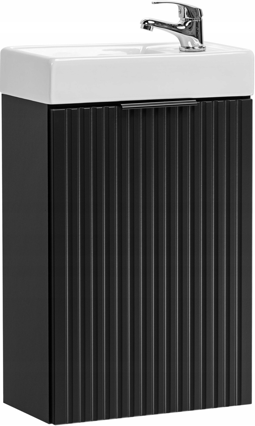 Meble łazienkowe Adel łączą elegancję i funkcjonalność. Pionowe, ryflowane fronty nadają meblom unikalny charakter i optycznie powiększają przestrzeń łazienki, a czarny kolor doskonale komponuje się z różnorodnymi aranżacjami wnętrz.