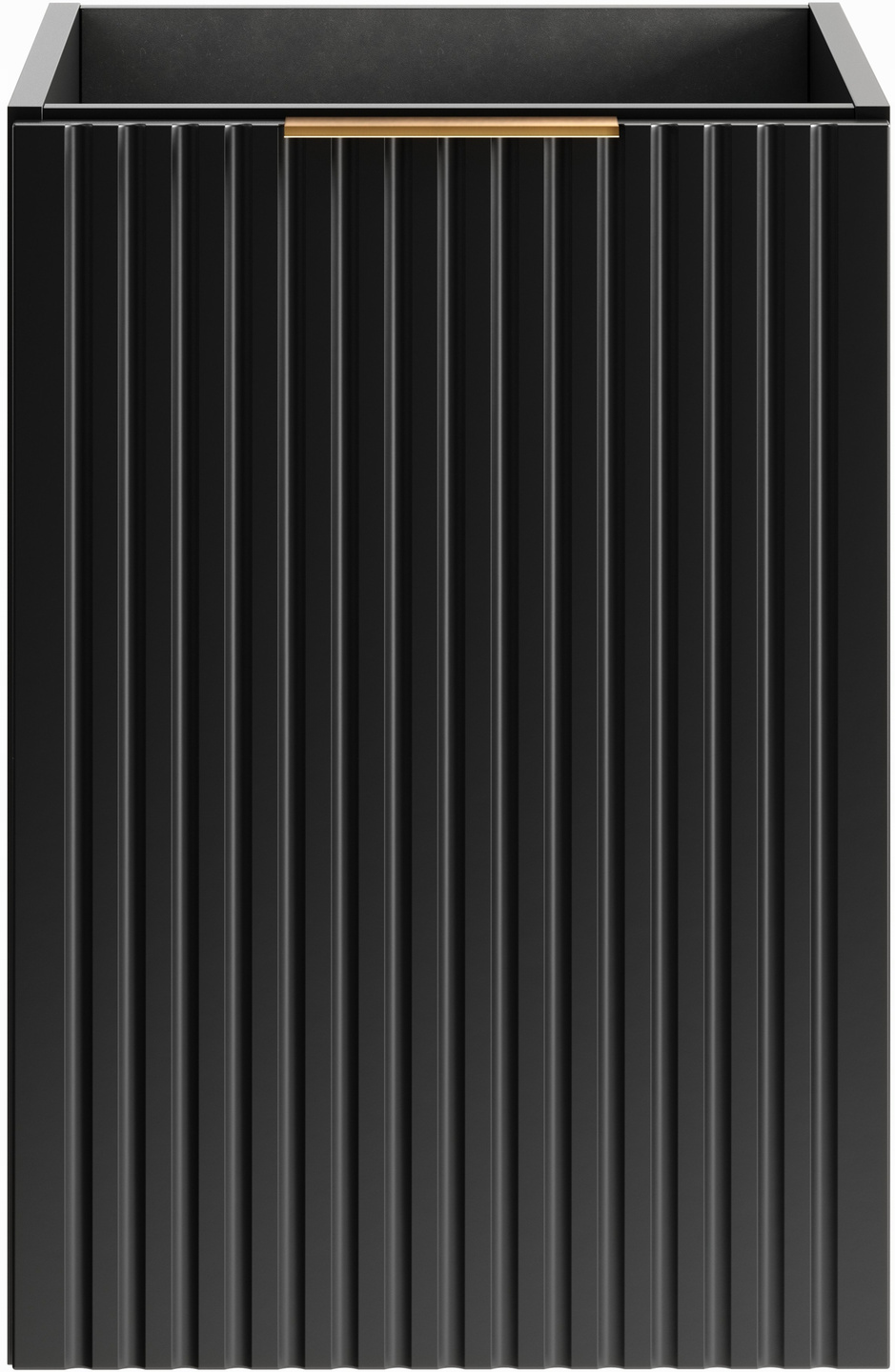 Meble łazienkowe Adel łączą elegancję i funkcjonalność. Pionowe, ryflowane fronty nadają meblom unikalny charakter i optycznie powiększają przestrzeń łazienki, a czarny kolor doskonale komponuje się z różnorodnymi aranżacjami wnętrz.