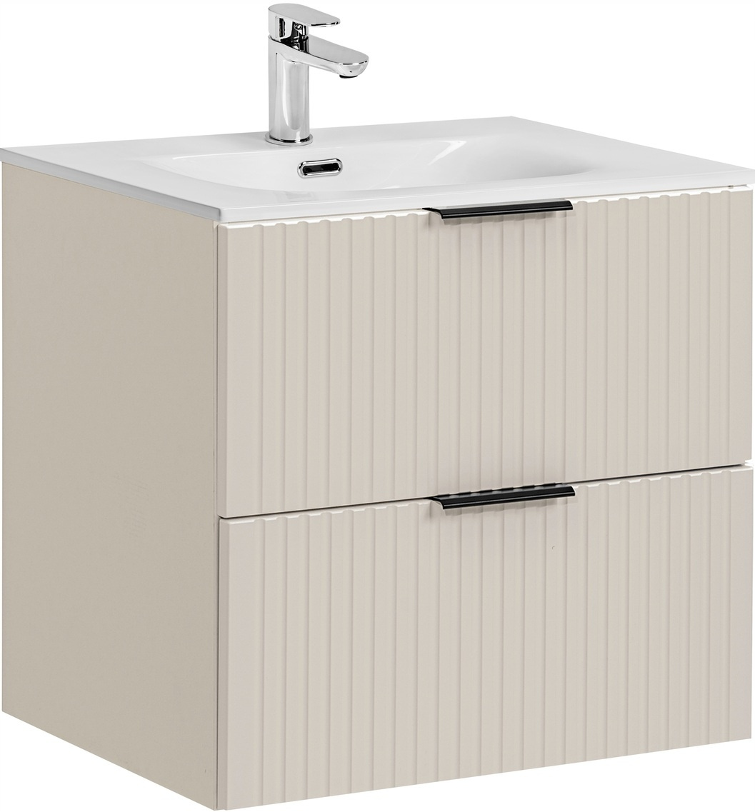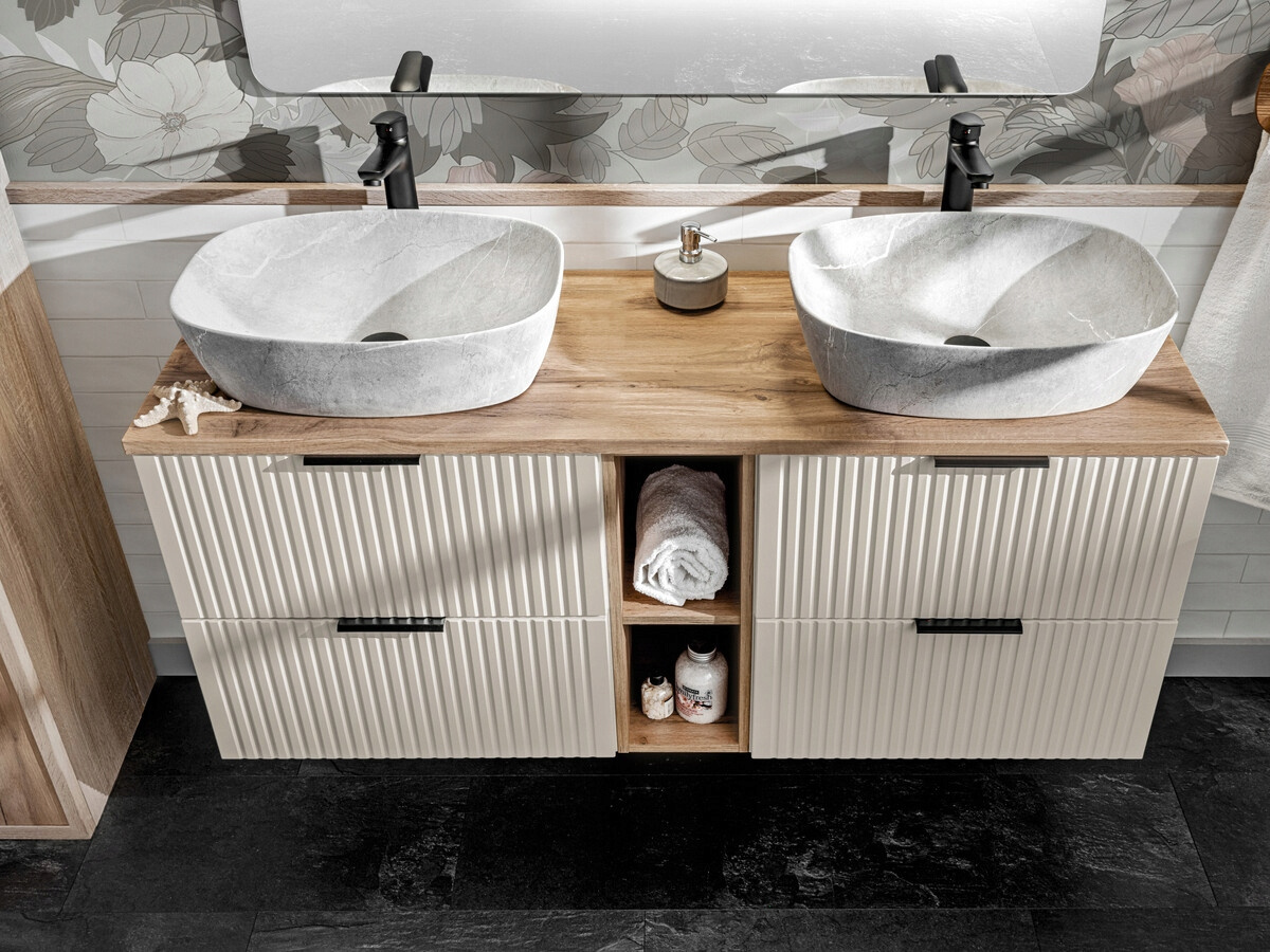 Meble łazienkowe Adel łączą elegancję i funkcjonalność. Pionowe, ryflowane fronty nadają meblom unikalny charakter i optycznie powiększają przestrzeń łazienki, a kaszmirowy kolor dodaje subtelnego ciepła, doskonale komponując się z różnorodnymi aranżacjami wnętrz.