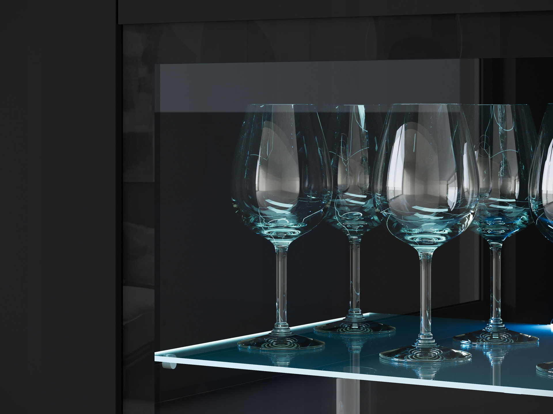 Szklane elementy można podświetlić oświetleniem LED co jeszcze bardziej uatrakcyjni witrynę i stworzy idealny klimat w pomieszczeniu.