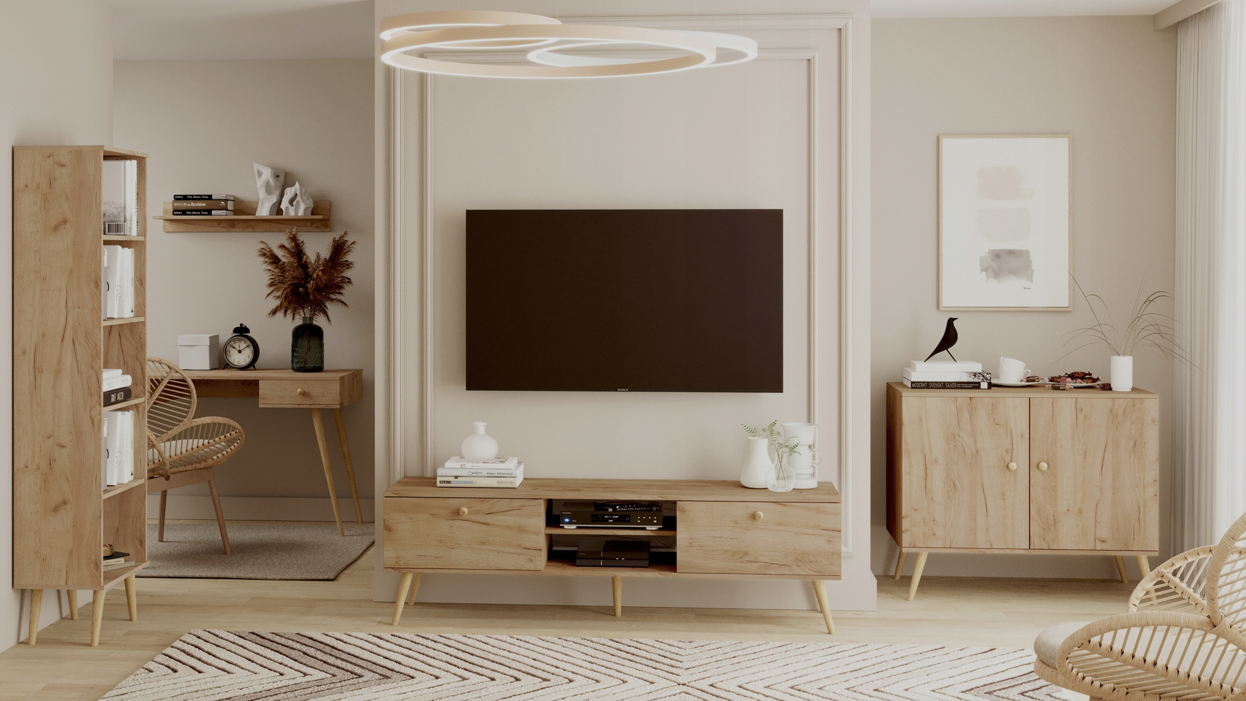 Aukcja dotyczy zestawu pięciu mebli BOHO w kolorze Dąb Craft Złoty: