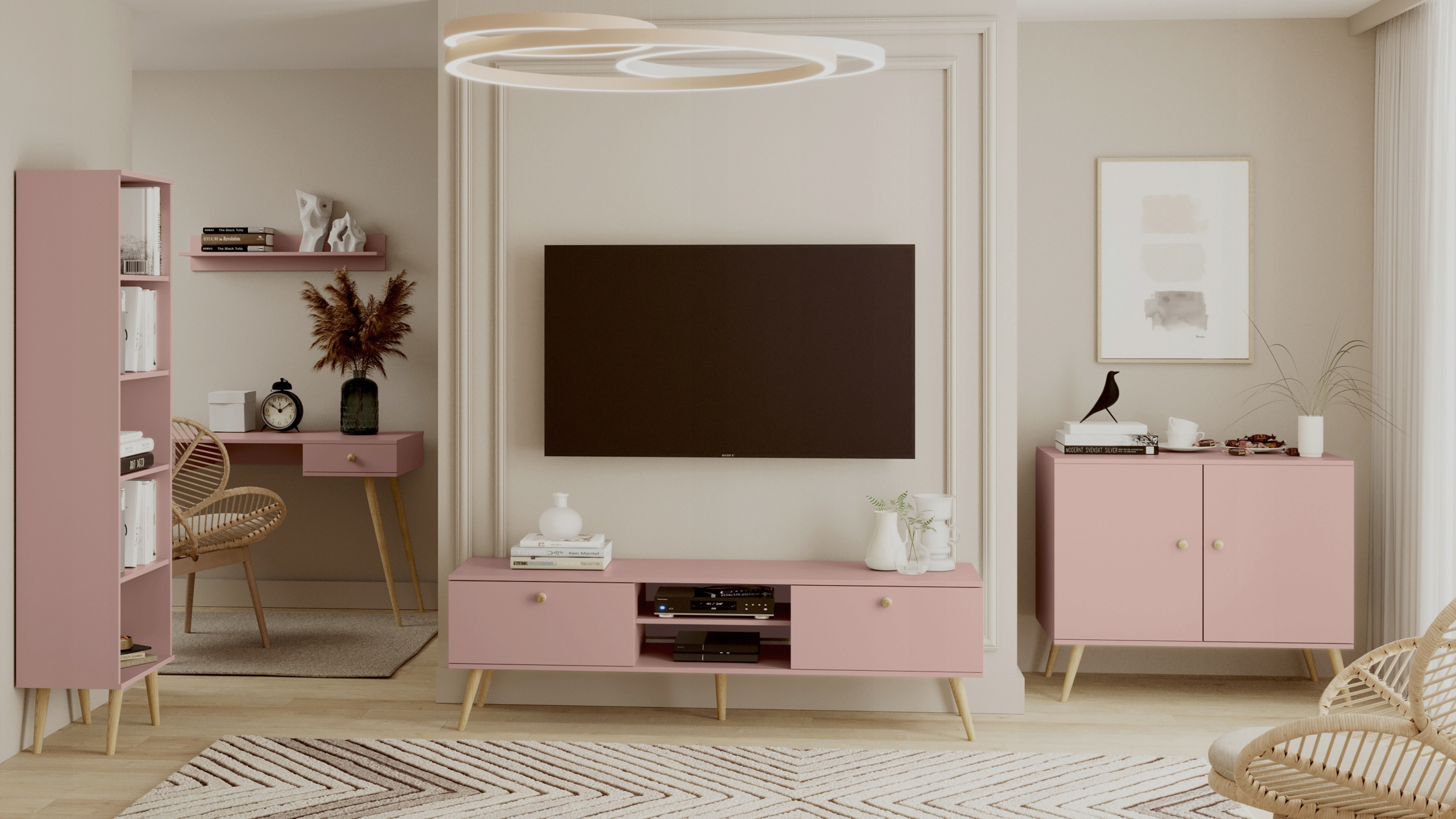 Aukcja dotyczy zestawu pięciu mebli BOHO w kolorze Róż: