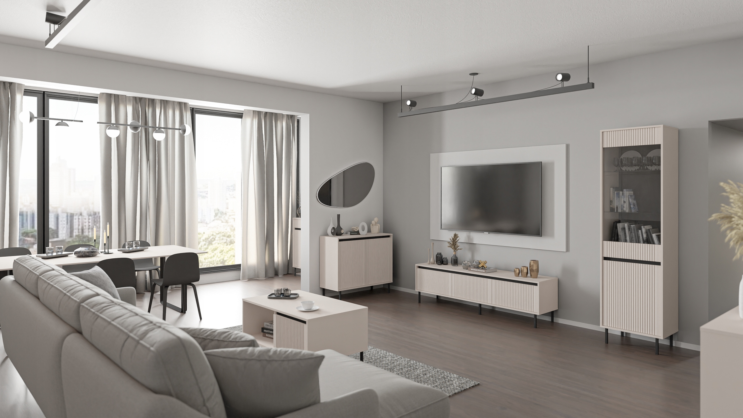 Zestaw mebli OSAKA Komoda + Szafka RTV + Witryna + Stolik BEŻ PIASKOWY