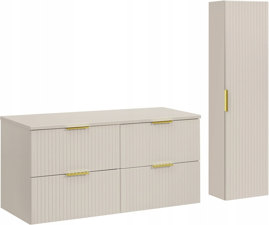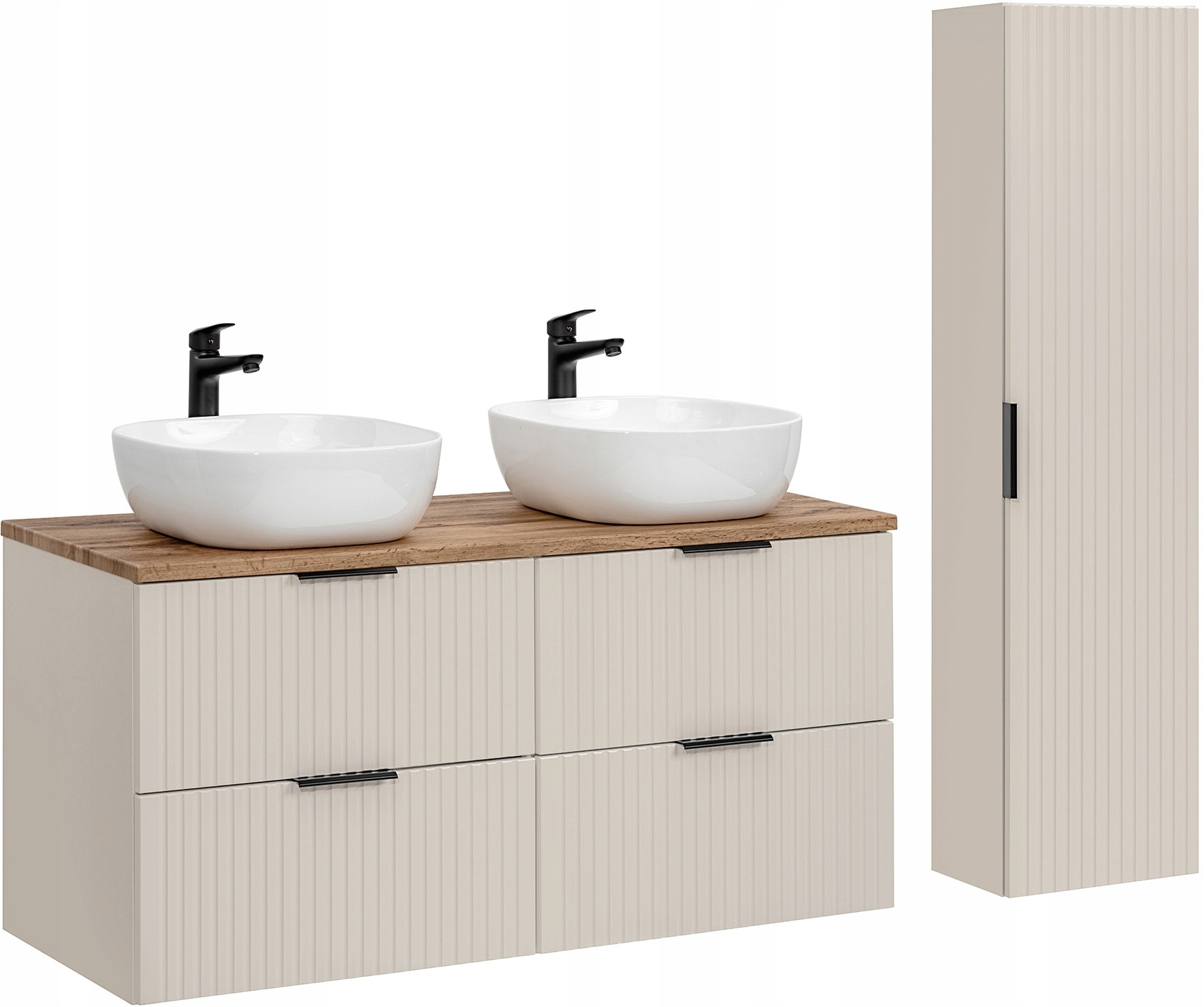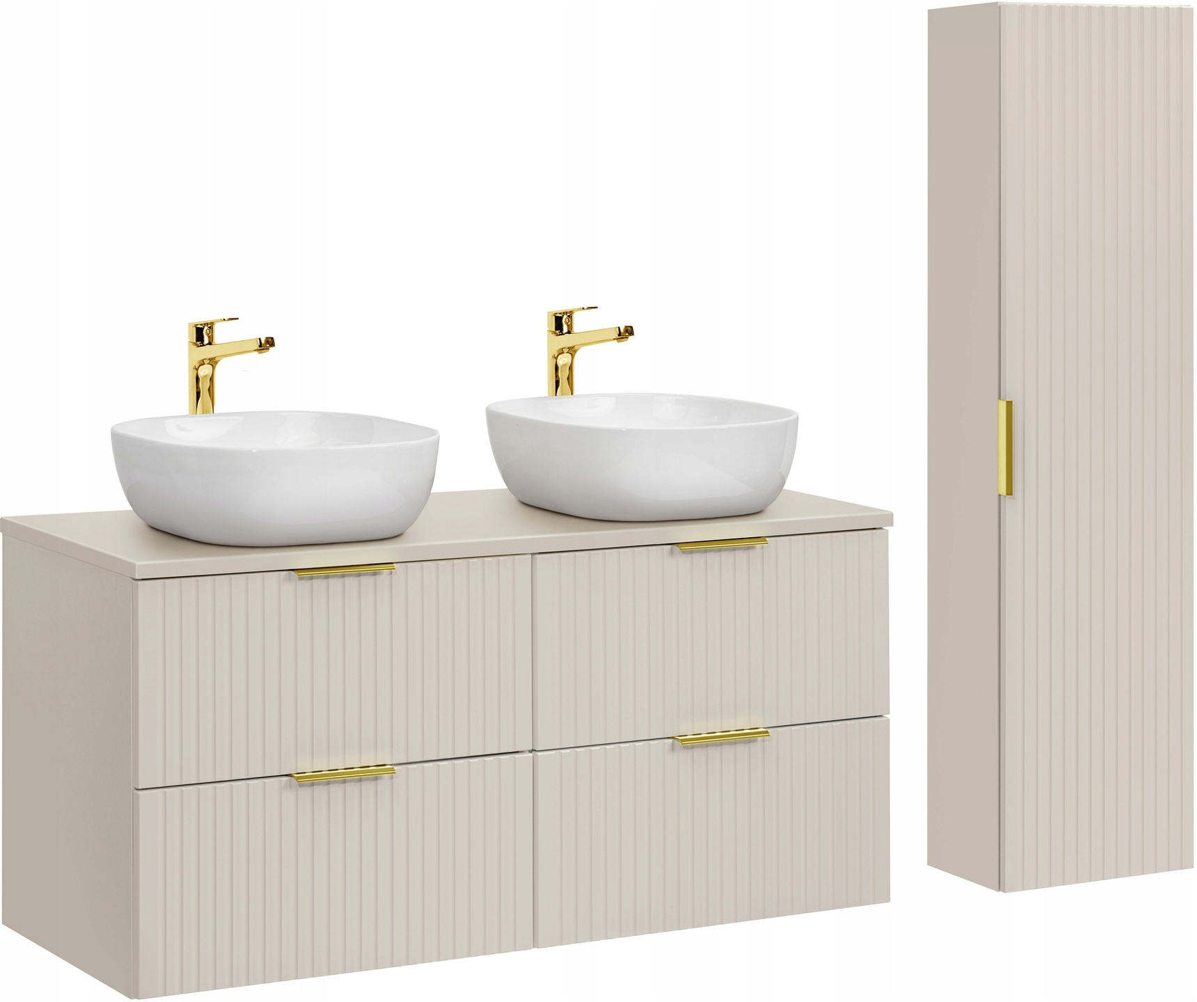 Meble łazienkowe Adel łączą elegancję i funkcjonalność. Pionowe, ryflowane fronty nadają meblom unikalny charakter i optycznie powiększają przestrzeń łazienki, a kaszmirowy kolor dodaje subtelnego ciepła, doskonale komponując się z różnorodnymi aranżacjami wnętrz.