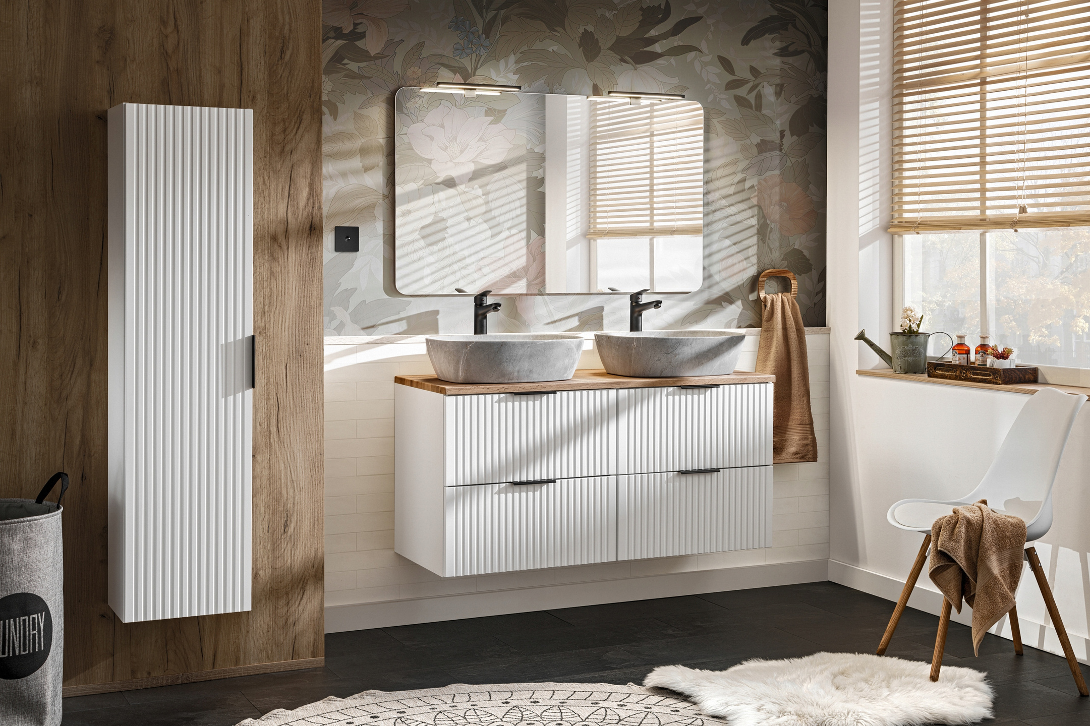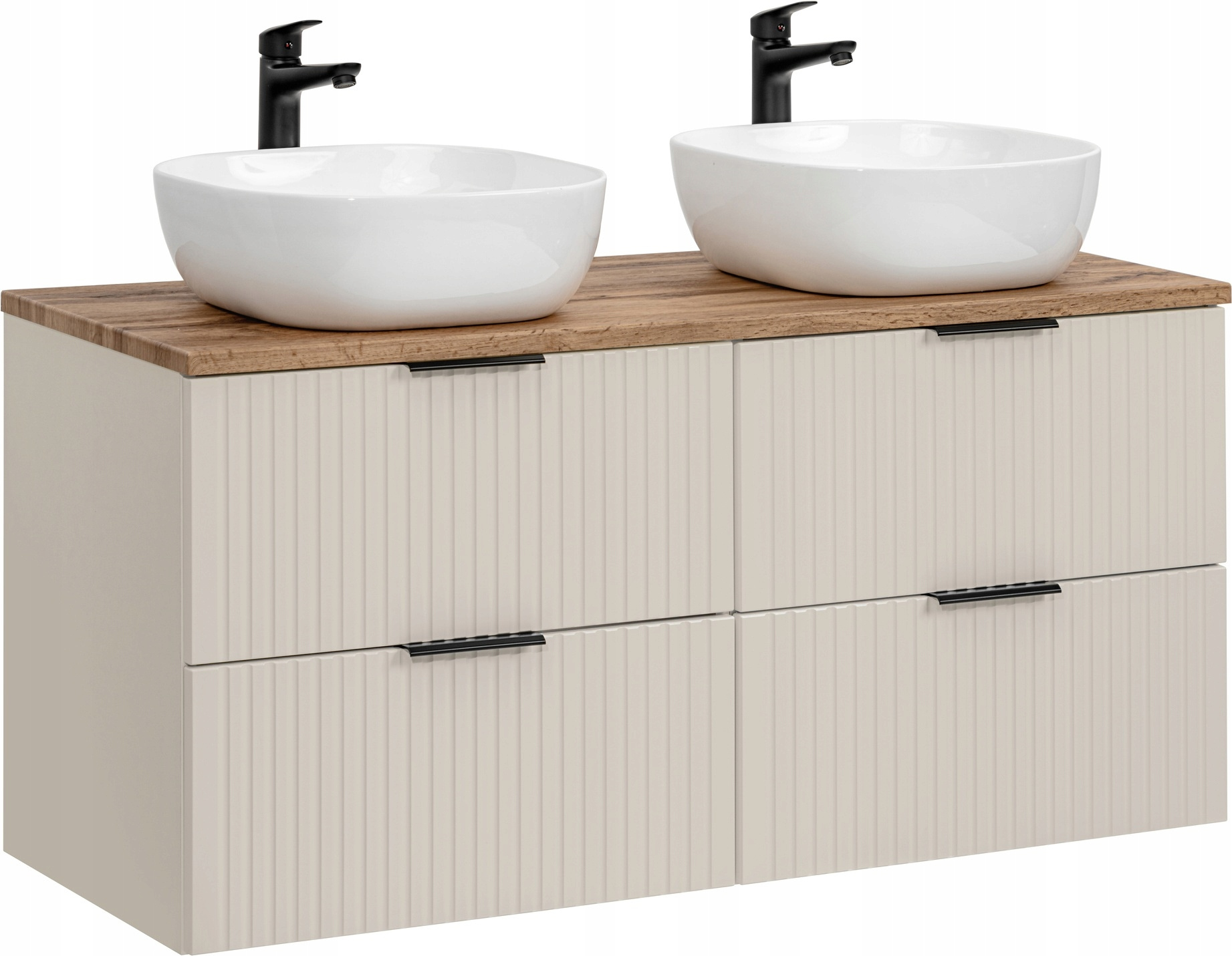 Meble łazienkowe Adel łączą elegancję i funkcjonalność. Pionowe, ryflowane fronty nadają meblom unikalny charakter i optycznie powiększają przestrzeń łazienki, a kaszmirowy kolor dodaje subtelnego ciepła, doskonale komponując się z różnorodnymi aranżacjami wnętrz.