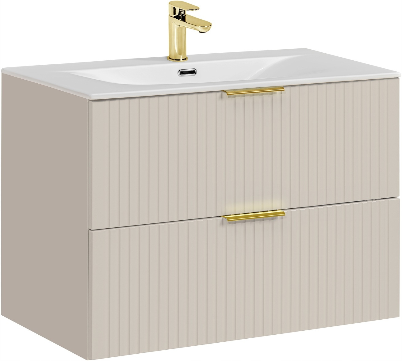 Meble łazienkowe Adel łączą elegancję i funkcjonalność. Pionowe, ryflowane fronty nadają meblom unikalny charakter i optycznie powiększają przestrzeń łazienki, a kaszmirowy kolor dodaje subtelnego ciepła, doskonale komponując się z różnorodnymi aranżacjami wnętrz.