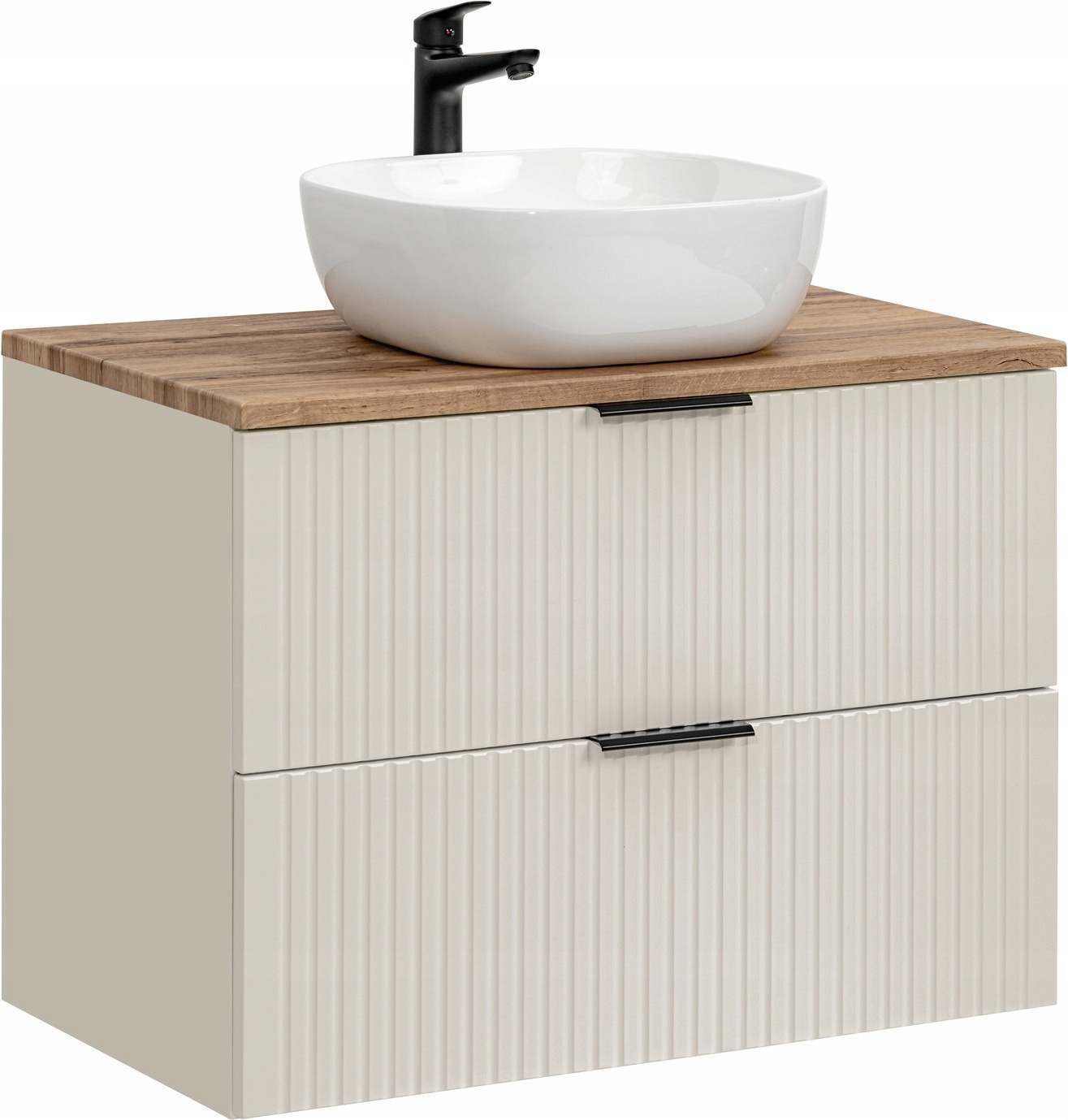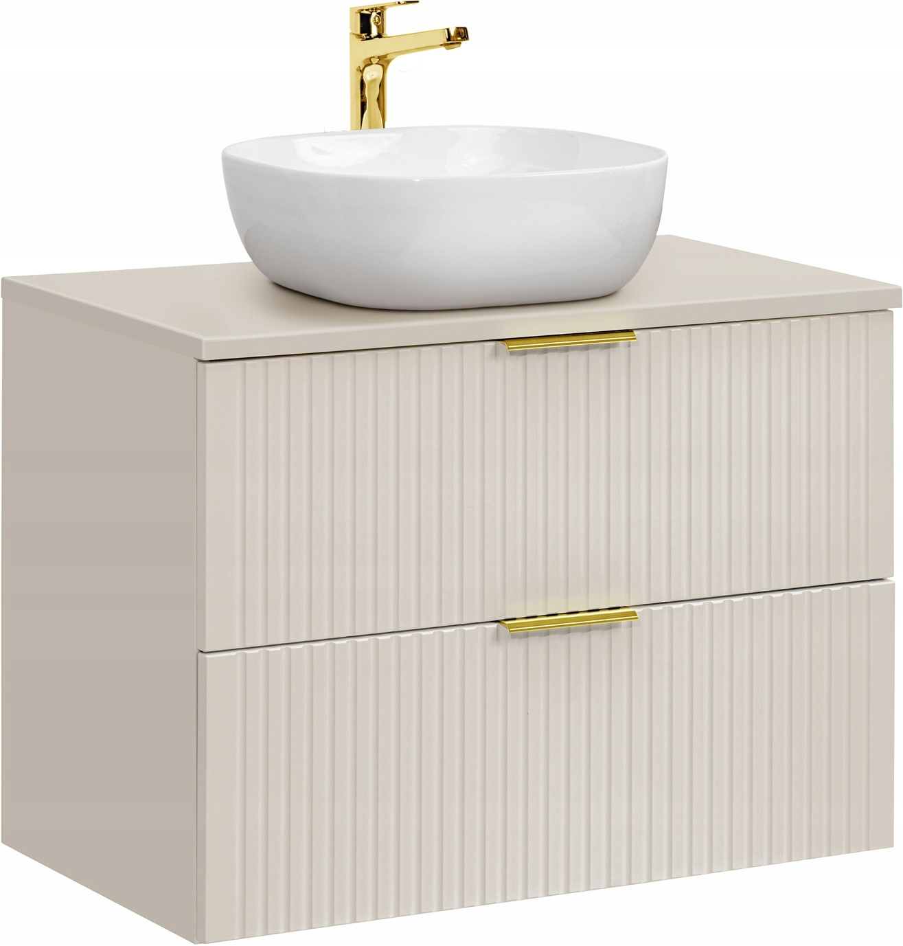 Meble łazienkowe Adel łączą elegancję i funkcjonalność. Pionowe, ryflowane fronty nadają meblom unikalny charakter i optycznie powiększają przestrzeń łazienki, a kaszmirowy kolor dodaje subtelnego ciepła, doskonale komponując się z różnorodnymi aranżacjami wnętrz.