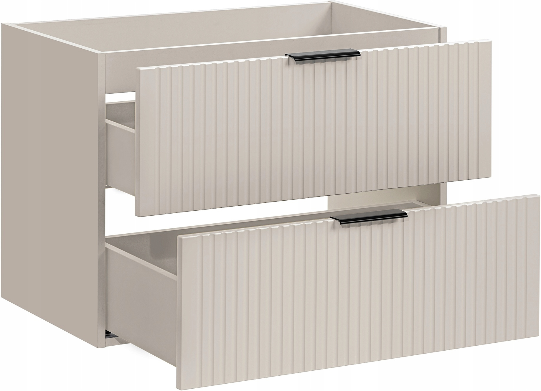 Meble łazienkowe Adel łączą elegancję i funkcjonalność. Pionowe, ryflowane fronty nadają meblom unikalny charakter i optycznie powiększają przestrzeń łazienki, a kaszmirowy kolor dodaje subtelnego ciepła, doskonale komponując się z różnorodnymi aranżacjami wnętrz.